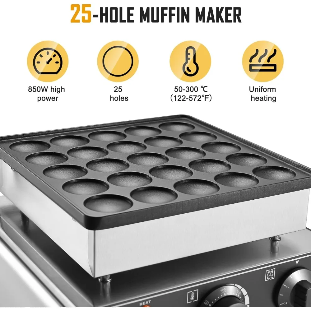 - 【Simple Operation Steps】: The operation interface is simple and clear. After preheating, just wait a few minutes to enjoy delicious mini pancakes. The operation console of the muffin machine includes timing and temperature control switches, heating indicator lights and power switches. Refer to the user manual for specific operation.