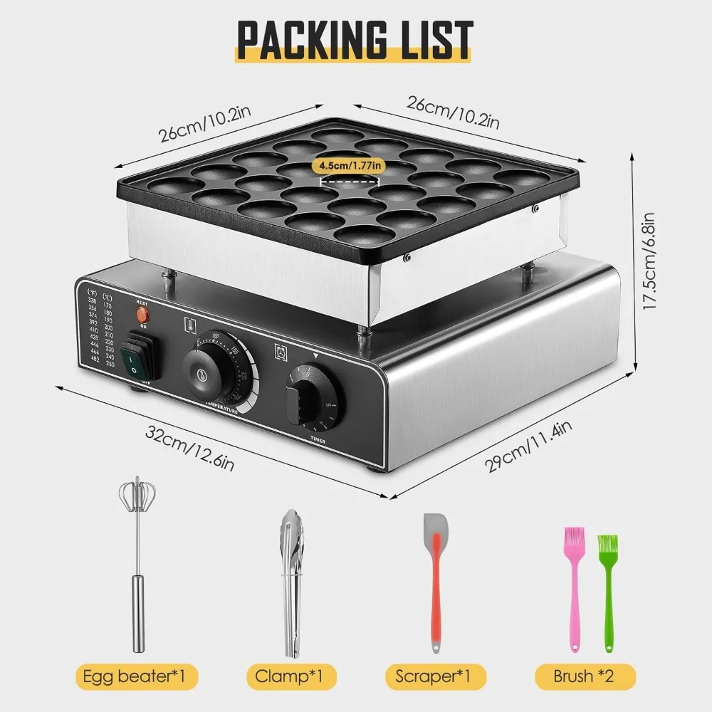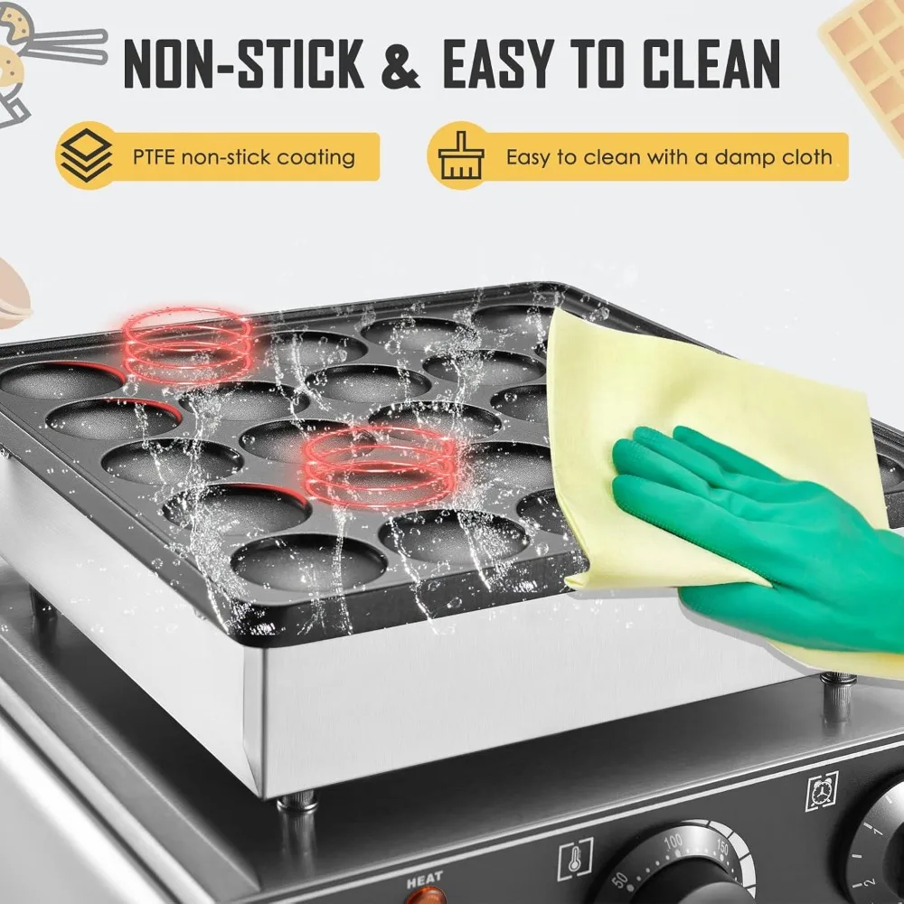 - 【Mini Dutch Pancakes Machine】: This commercial pancake maker adopts to a high-quality food-grade stainless steel body and a non-stick cast aluminum plate. It’s sturdy and durable, high temperature resistant, moisture-proof and rust-proof.