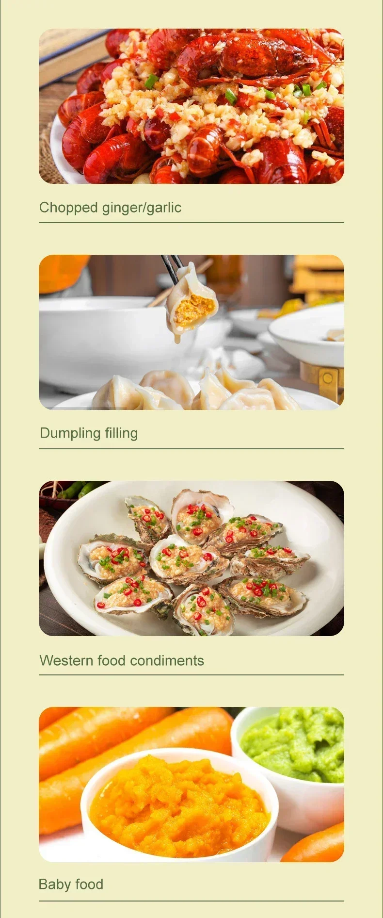 3. Quick Chop: The sharp blade of the garlic chopper can quickly chop garlic, spices, nuts, vegetables, meat, ice cubes, etc. It is very suitable for small foods. You can use it for cooking, supplementing baby food, smoothie drinks.