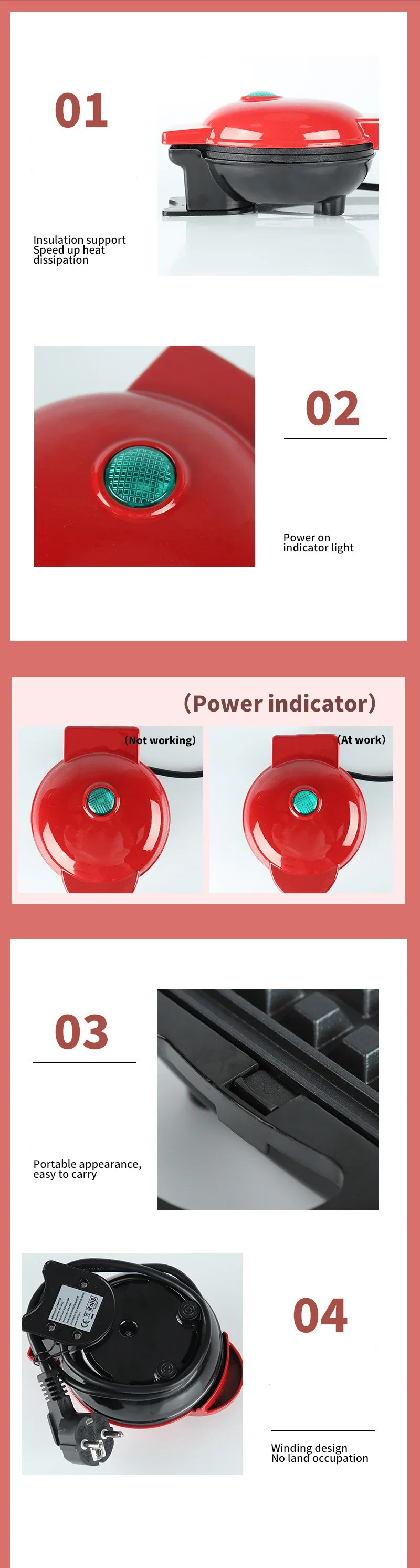 2. Safe use: The waffle maker comes with a built-in power indicator light, and food grade PTFE is heat-resistant, ensuring safe consumption. The machine is equipped with an insulated bracket to accelerate heat dissipation and ensure safety. After use, there is no need to worry about the product being hot to the hands.