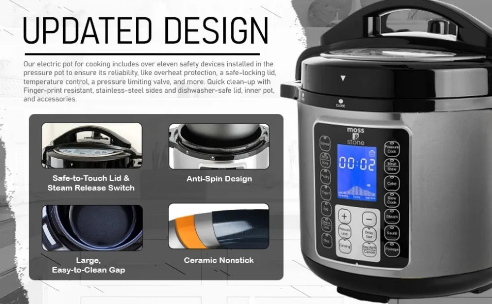 - 9 Appliances In 1: moss & stone replaces your 9 common kitchen appliances with 1 that will cook in less than half the time. pressure cooker, slow cooker, sauté pan, rice cooker, yogurt maker, cake maker, egg cooker, seamer, and food warmer. All in one electric appliance.