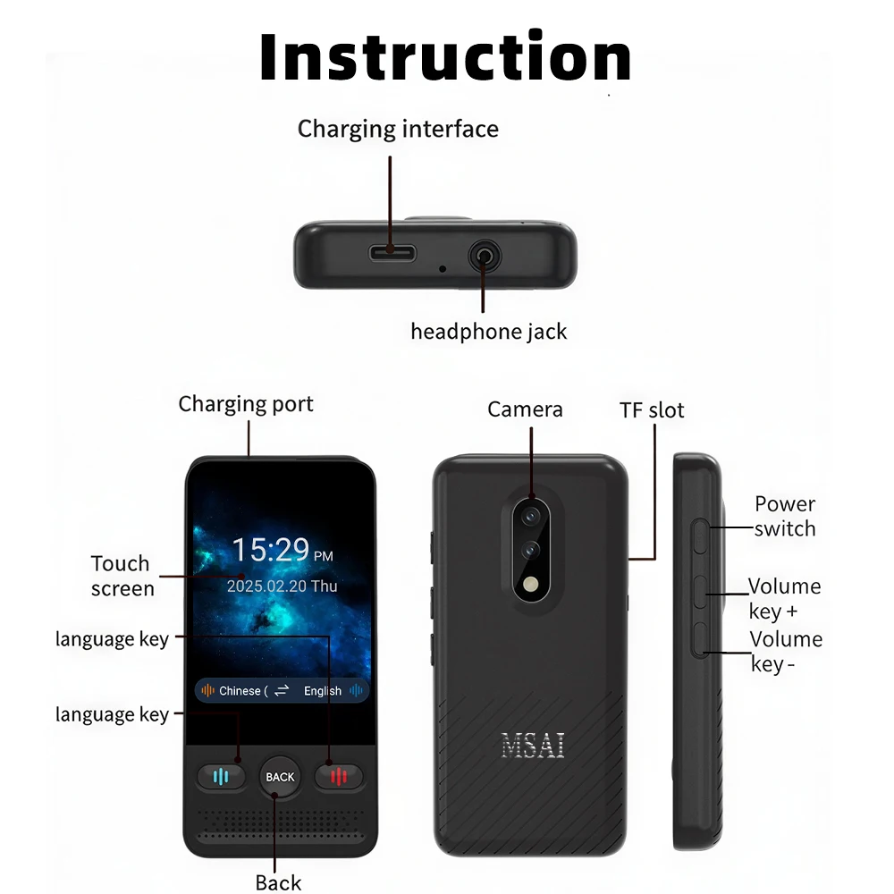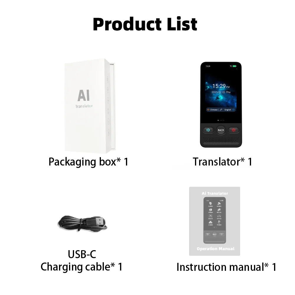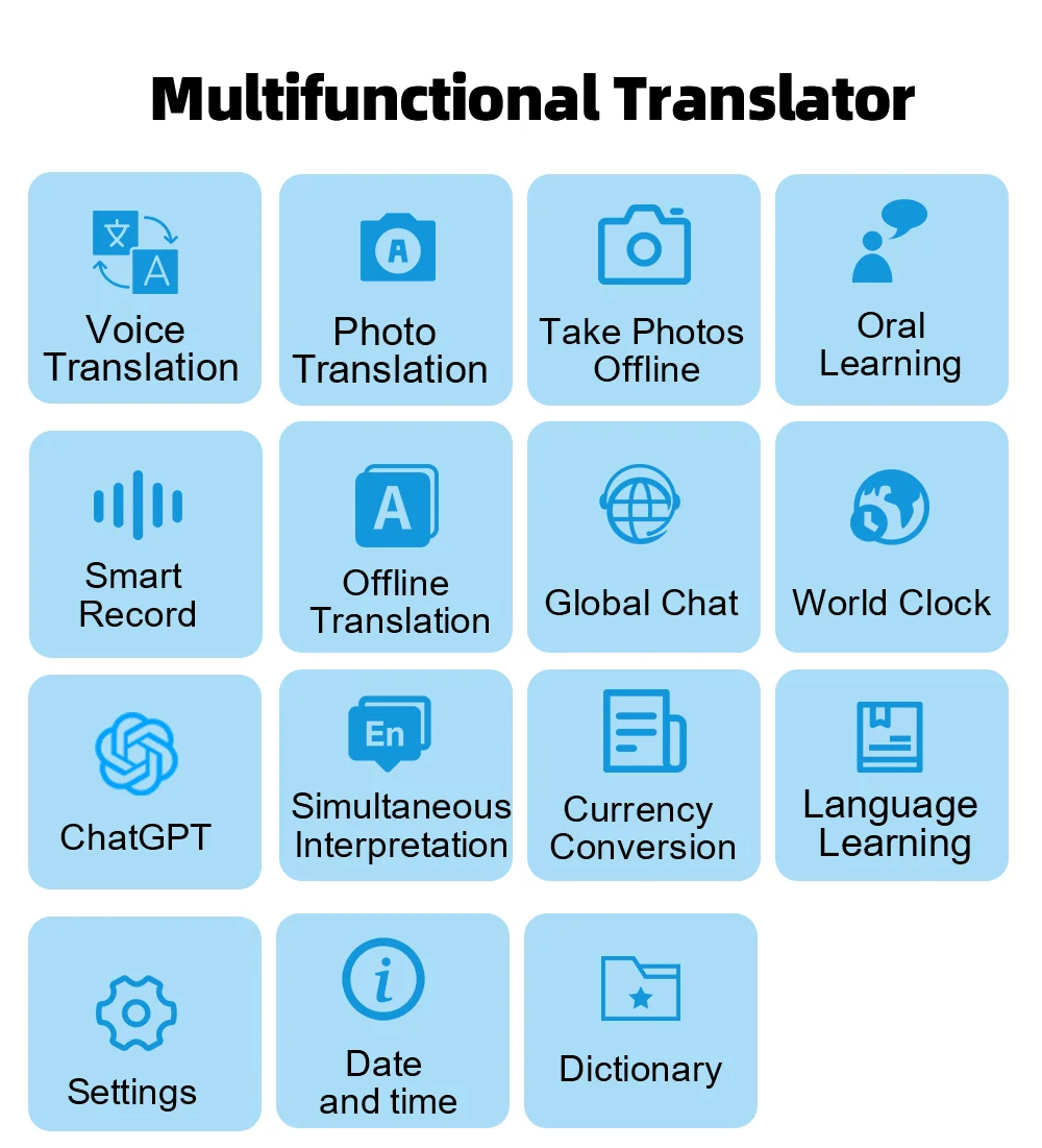 Functional: Online Translation/Offline Translation/Photo Translation/Offline Photo/Intelligent Recording/Simultaneous Interpretation/Input Translation/Mobile Phone Translation /ChatGPT/DeepSeek/ Global Chat/Currency Conversion/Language Learning/World Clock/Collection/Google Search/Multimedia (Video and Audio Playback)/Oral English Learning/Word Bank/Settings