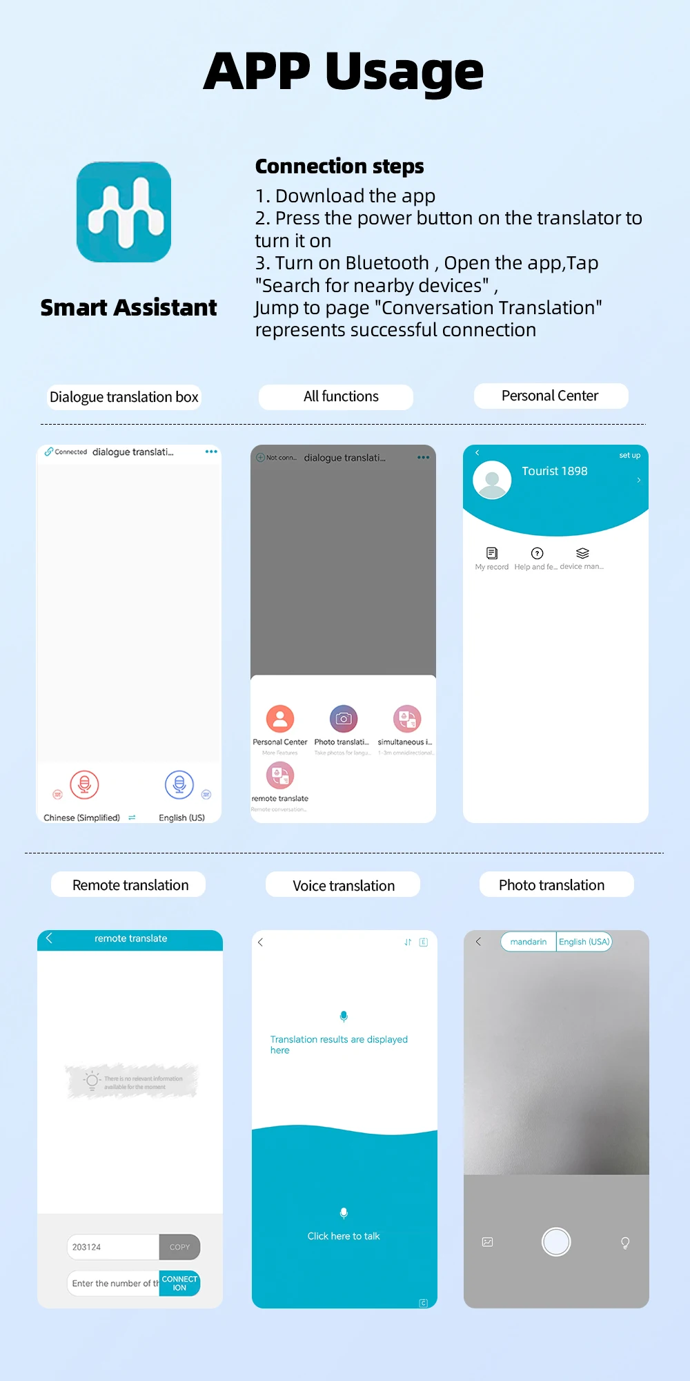 Function: intelligent dialogue, voice translation, photo translation, text translation, remote conversation translation, recording to text, recording translation