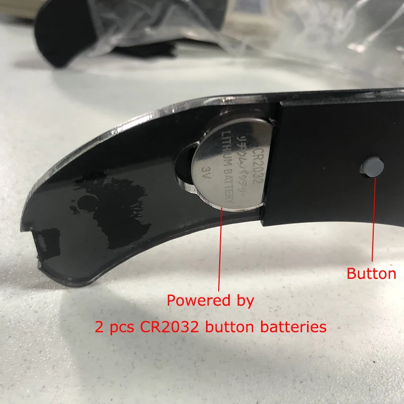 1.Place the battery : There is one battery compartment on the left and right sides. Slide back the battery cover to open it , and place 1 pcs CR2032 button battery in each compartment. The battery is placed with the positive electrode facing outward. After placing the battery, close the battery cover.