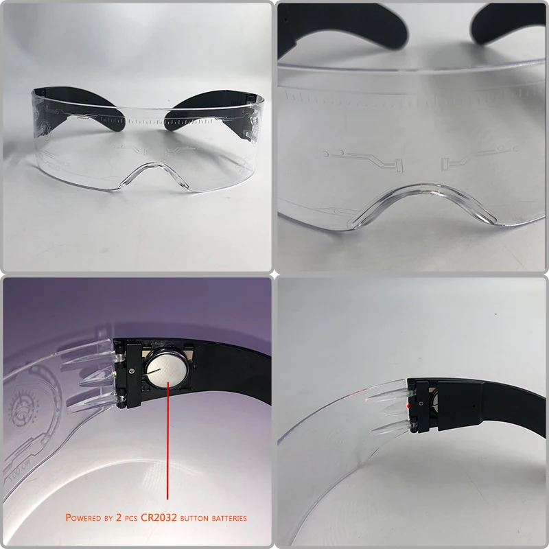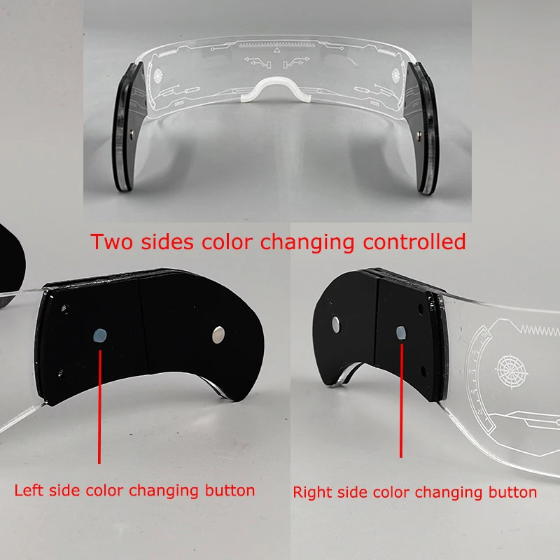 2. Select the lighting mode : LED glasses is two sides controlled . Press the black button on the side, and each time you press it, the LEDs will change among below 12 lighting modes: