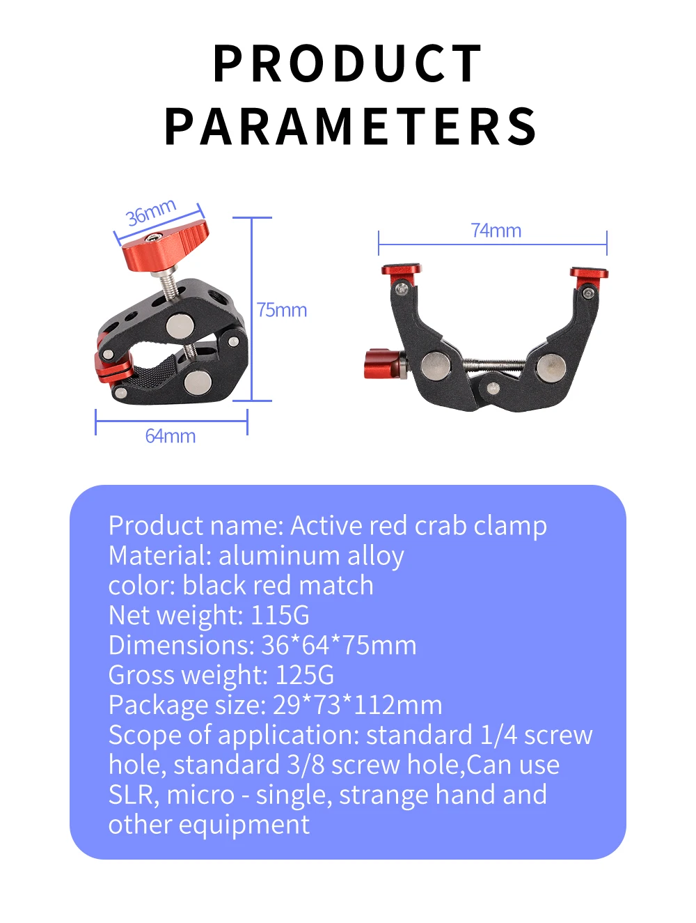 Scope of application: standard 1/4 screw hole, standard 3/8 screw hole,can use sLR, micro-single, strange hand and other equipment