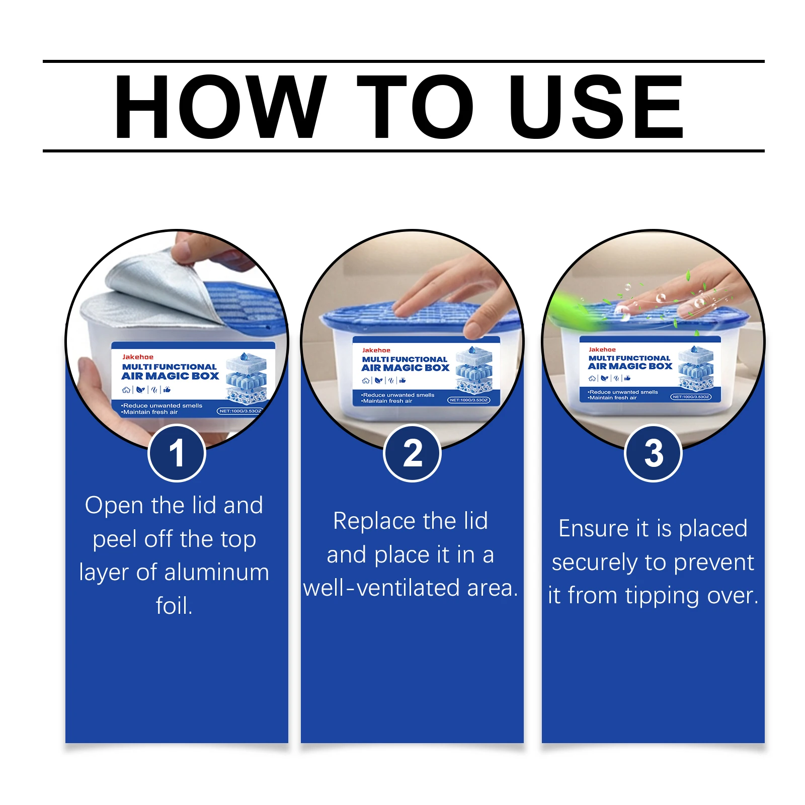 Place: Put the lid back on and position the box in any well-ventilated area that needs freshening up (e.g., on a shelf, in a corner). For best results, place one in each problem area!
