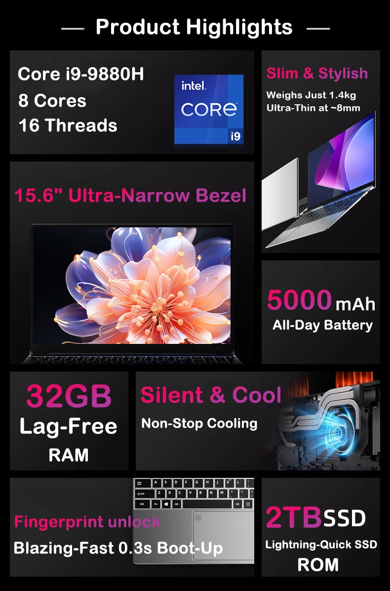 New 15.6″ Laptop Intel Core i9-9880H 32GB 2TB Gaming PC Ultra Slim Office Study Computer PC Windows 11 Pro 1920*1080 HD