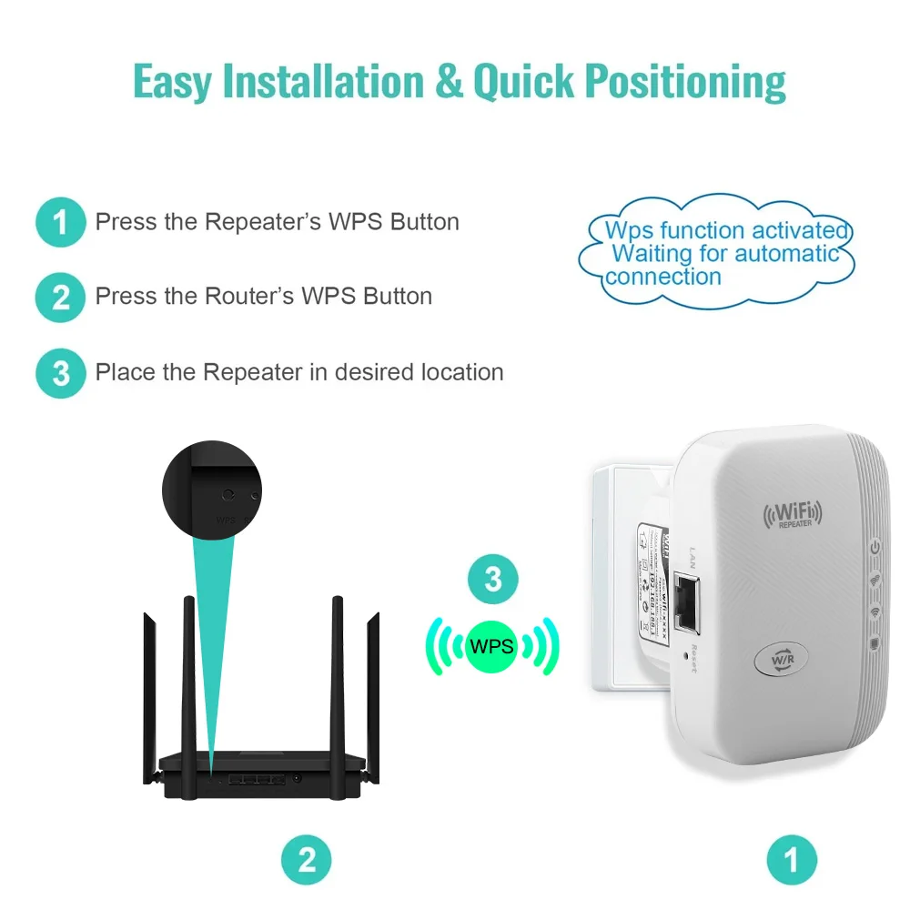 【Plug and Play】Easy to install and use.Only takes 8 seconds! Wi-Fi signal booster can easily expand the wireless coverage by press the WPS button.