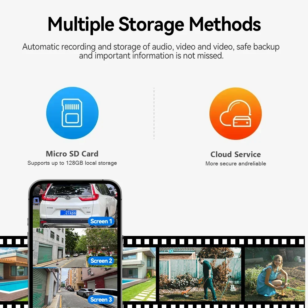 This video surveillance camera supports Micro SD card storage up to 128GB (videos can be replayed in LAN network). Cloud storage to avoid the risk of losing footage from SD card. You can log in encrypted mobile phone app to instantly pinpoint your footage through an intelligent timeline and play it back in seamless and brilliant HD quality (SD card space size can be selected in the options!).”