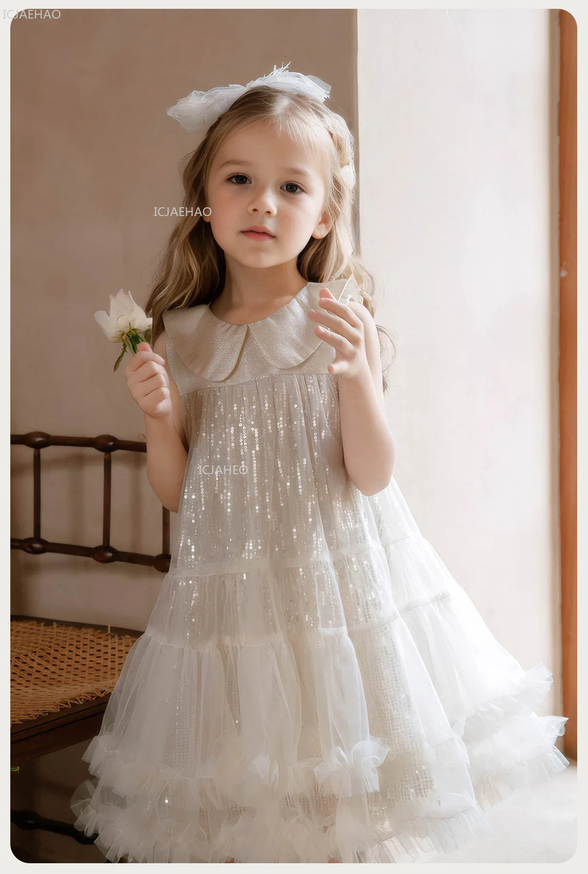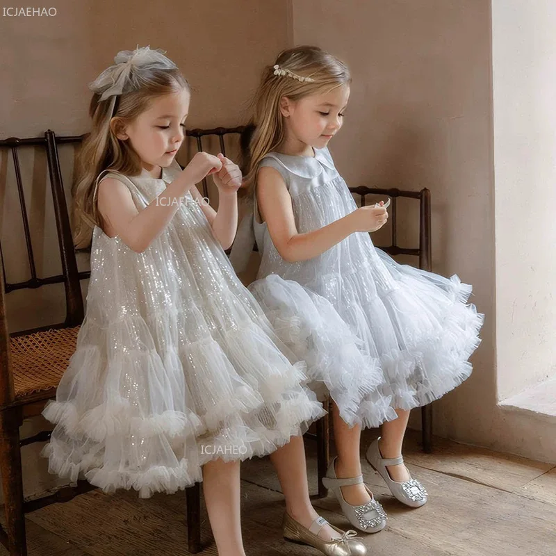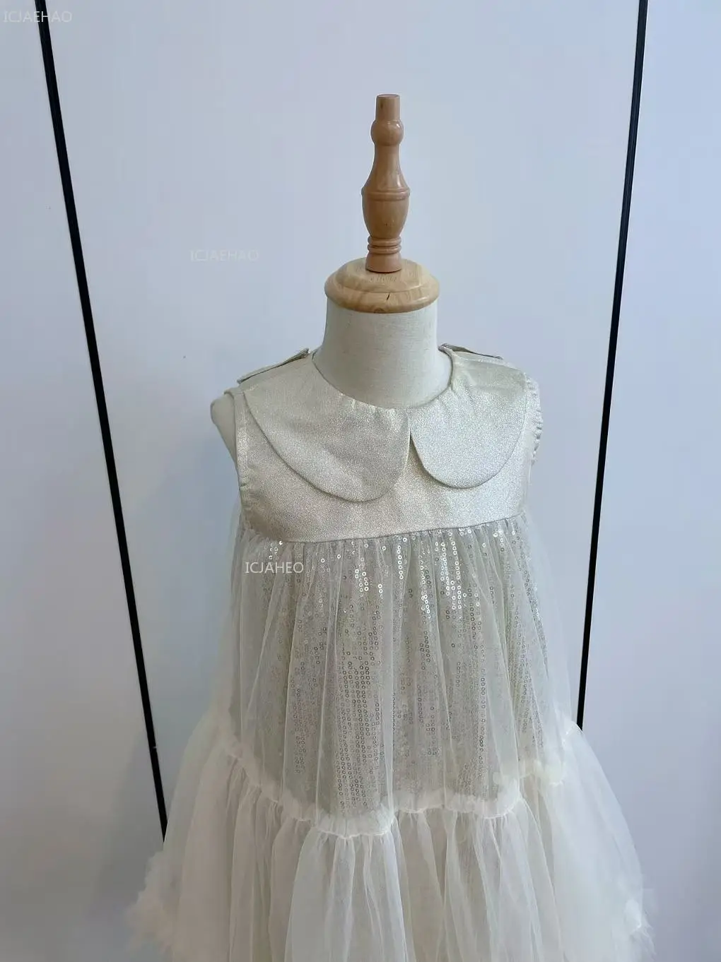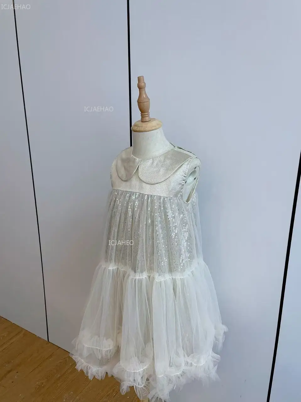 New Children Girls Party Dress Peter Pan Collar Sleeveless Tulle Princess Gown for Host Piano Performance Banquet Pageant Formal
