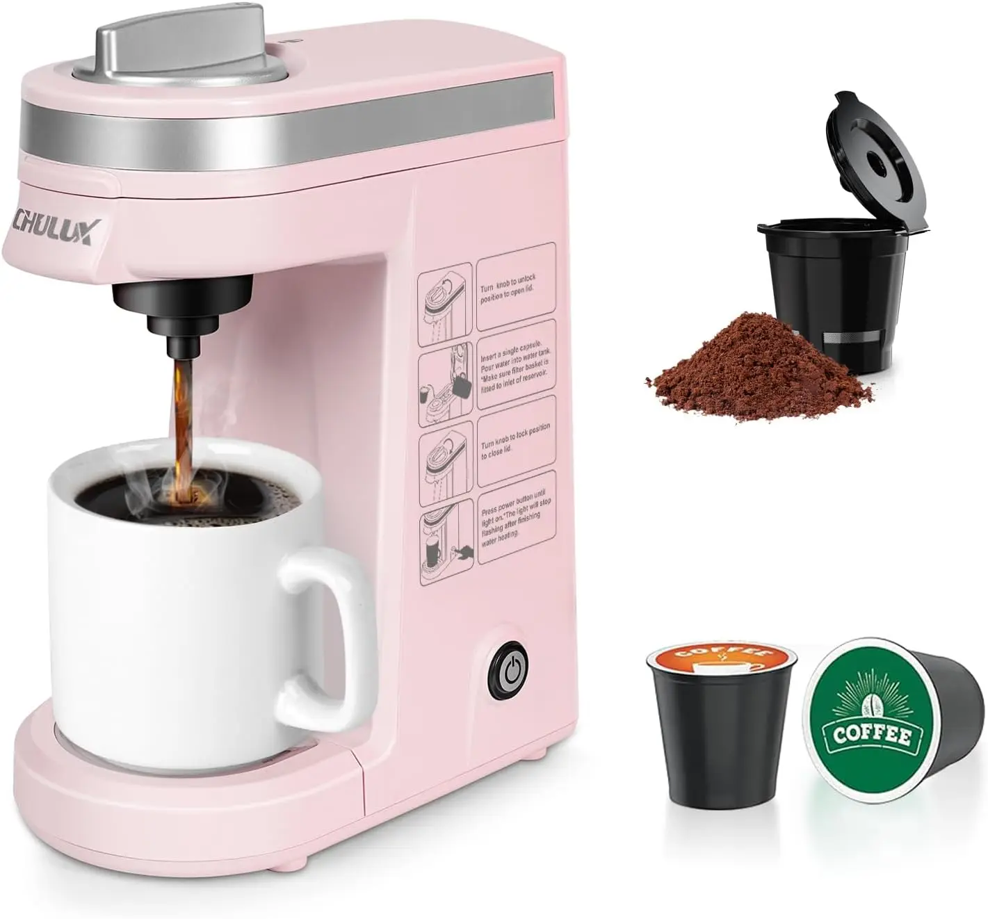 - 【SINGLE CUP COFFEE BREWER】 CHULUX single serve coffee maker compatible with 1.0 and 2.0 pod coffee capsules. Also suitable for use ground coffee (Included a black reusable filter ) to create your private cafe at leisure or busy moment.