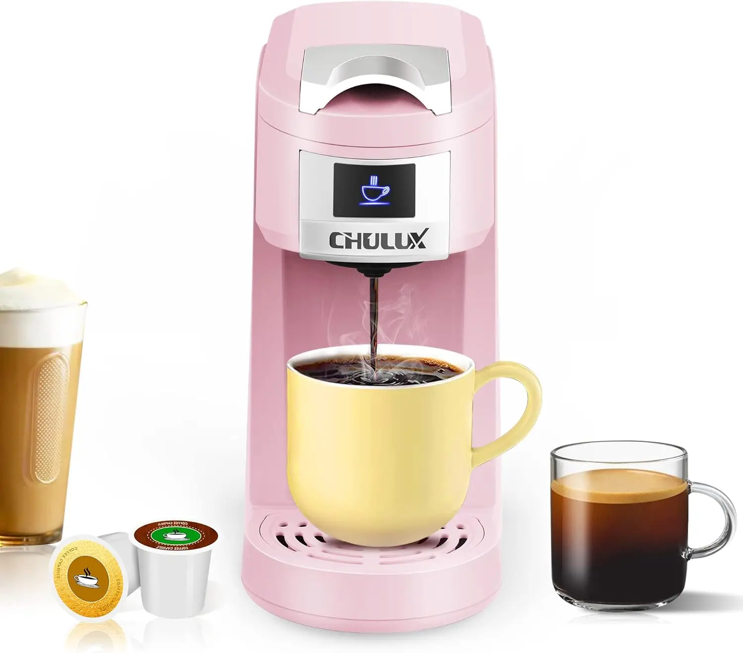 - Fast Brewing & Heat up Technology – CHULUX small coffee brewer can quickly brew a 5 – 12oz cup of hot coffee at 180°F. Instant Heat up Technology has NTC heating element with fast brewing system by blue indicator light flash, also features auto shut – off preventing from overheating and keeping safe.