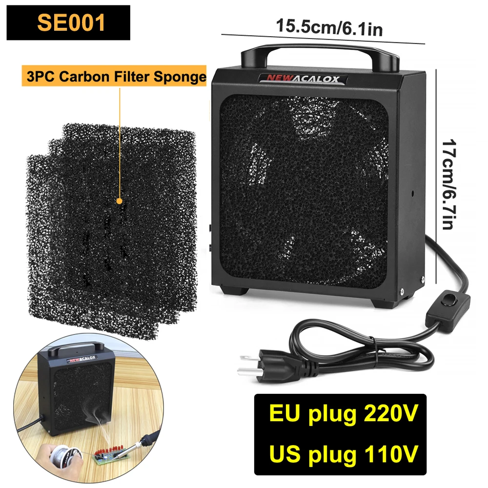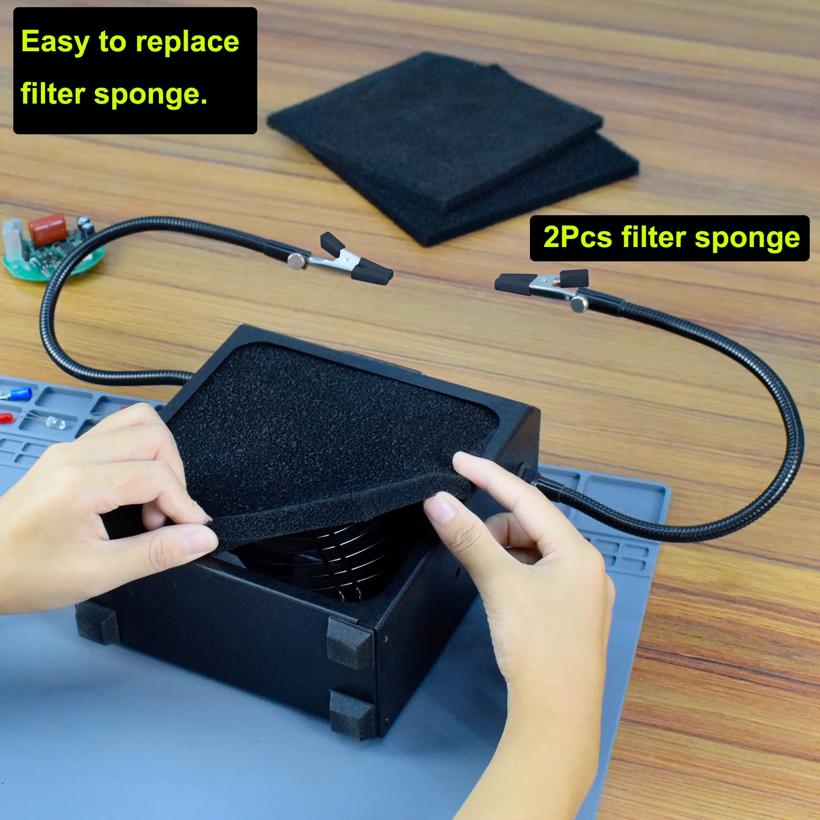 1.Low Noise Fan with Smoke Filter: ESD safe smoke Extractor fan with 0.4 inch thick activated carbon filter can extract away the solder, flux, chemicals, gases or other hazardous substances in the solder smoke, and purified by the activated carbon filter net. Recommended filter net replacement every 4 to 5 months depending on usage.