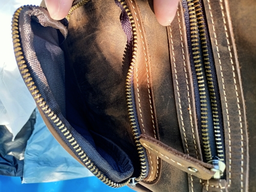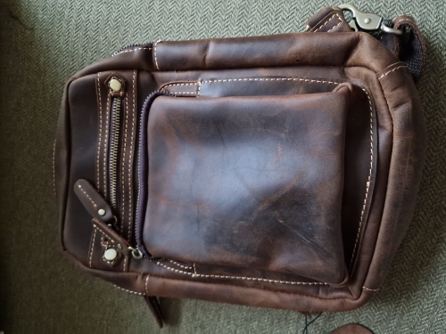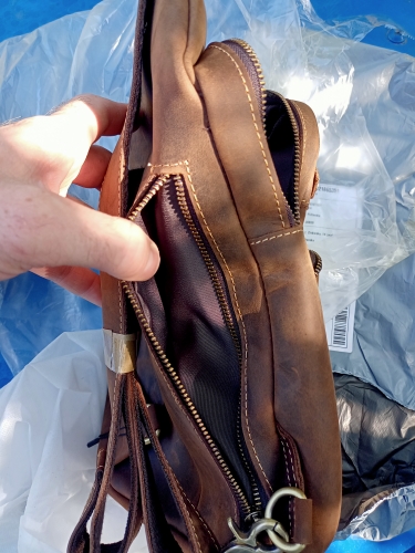 Bag made of thick cowhide leather. All the seams are sewn smoothly. I don't know, however, how strong her fasteners are. Let's see when operating. Took it as a gift to a young guy. I hope he likes it.