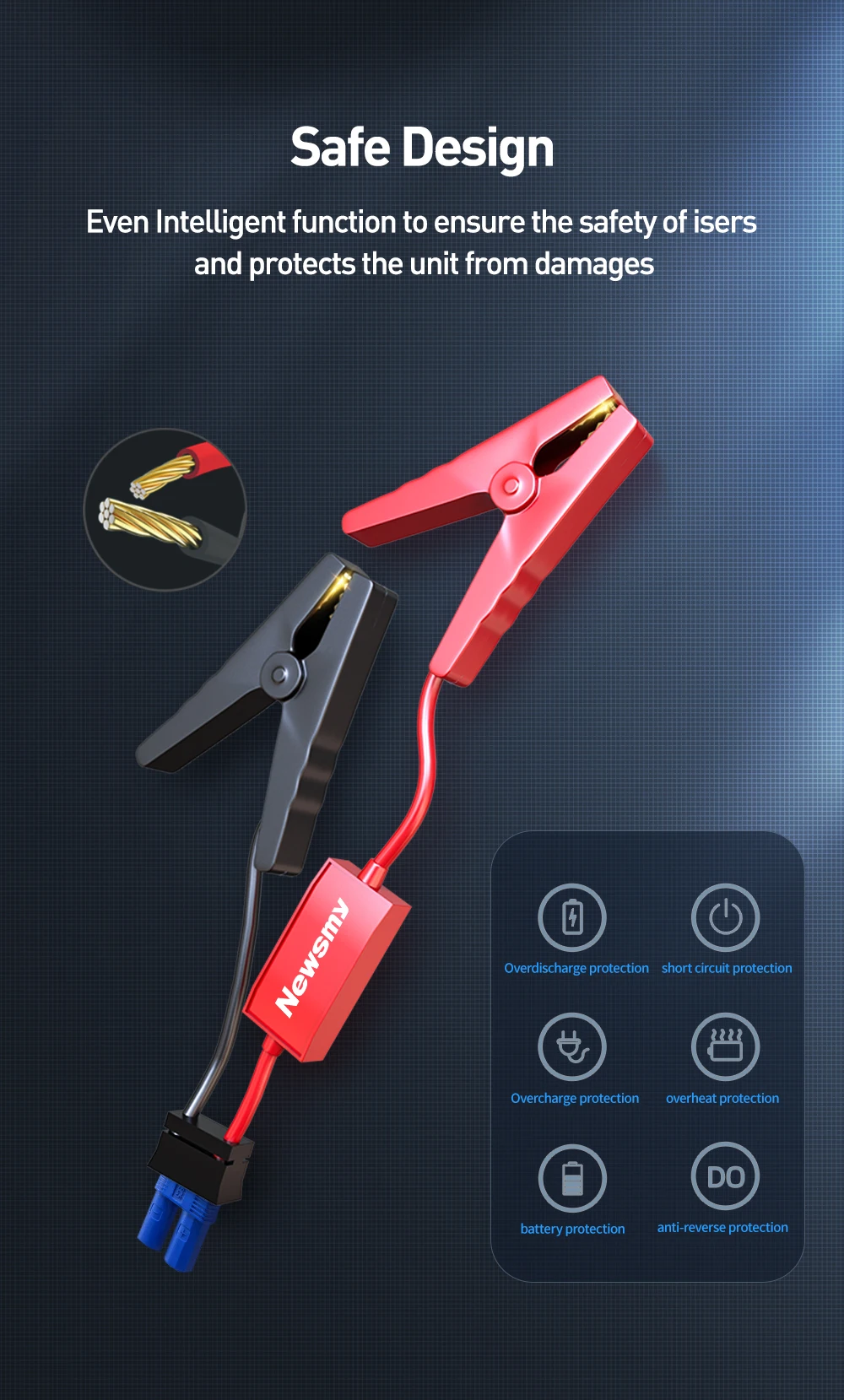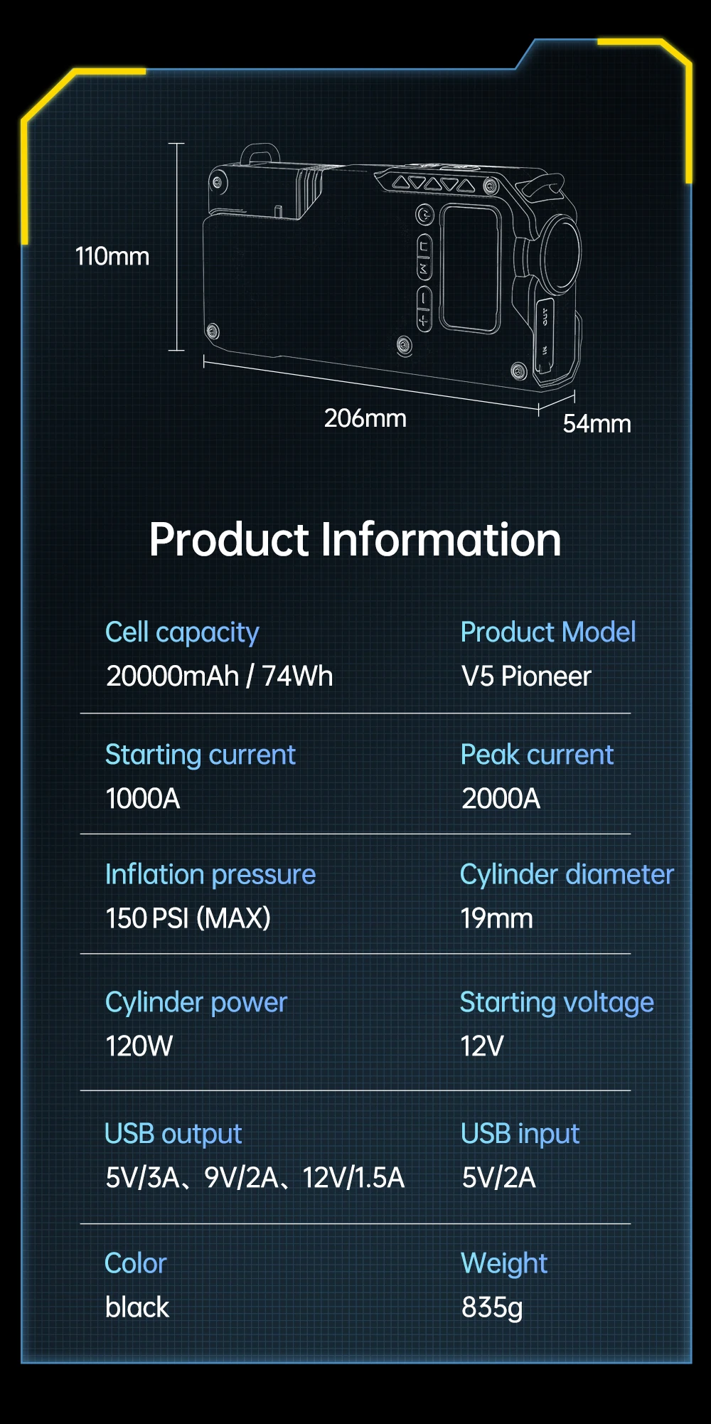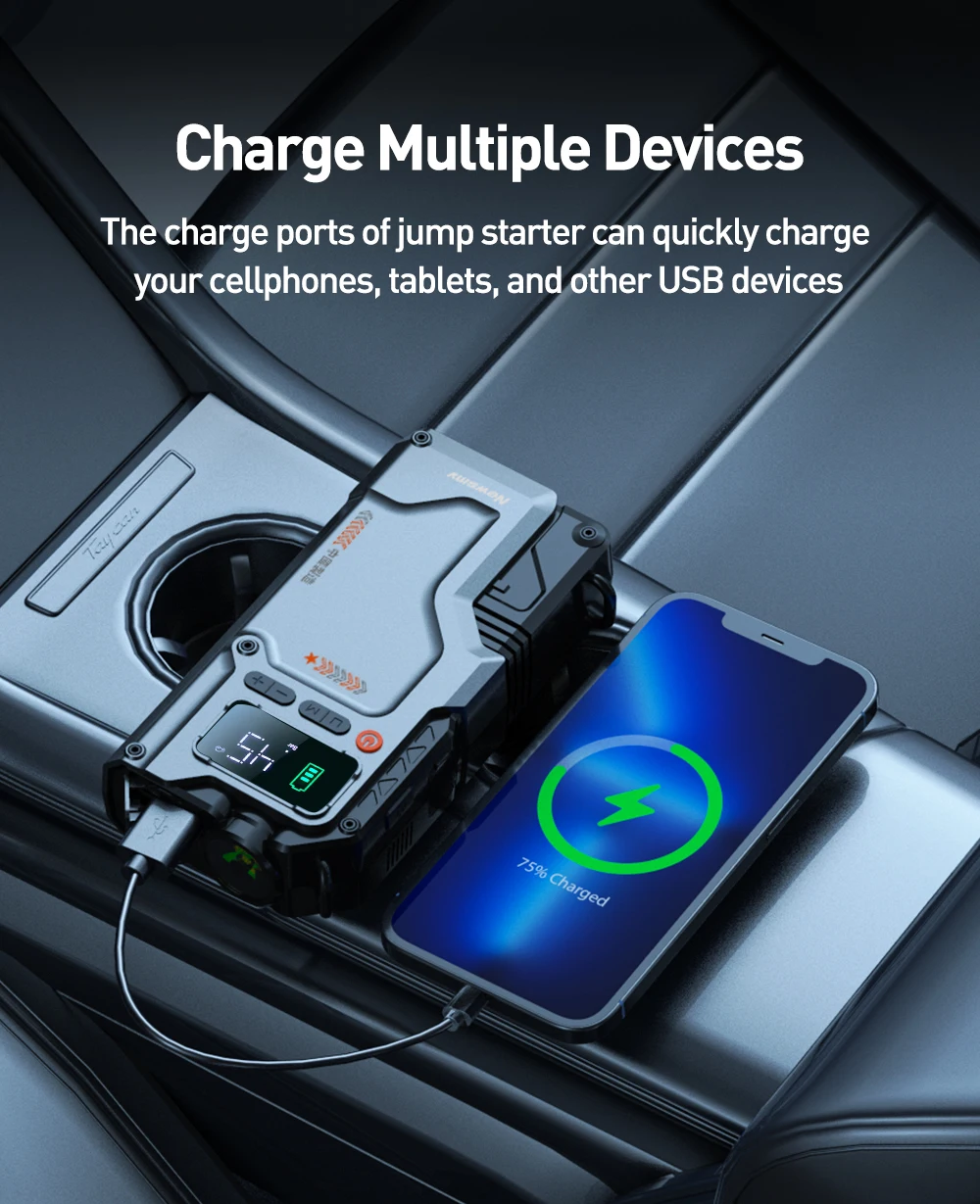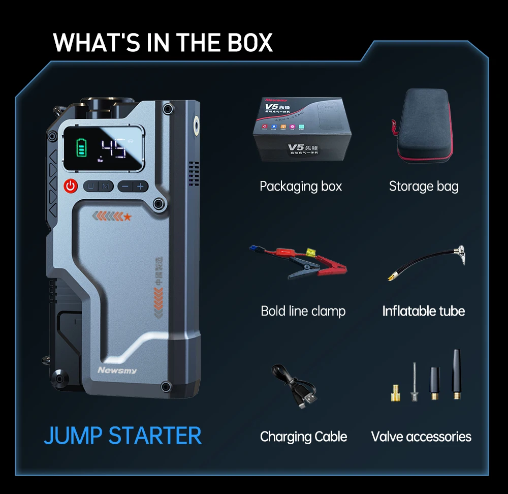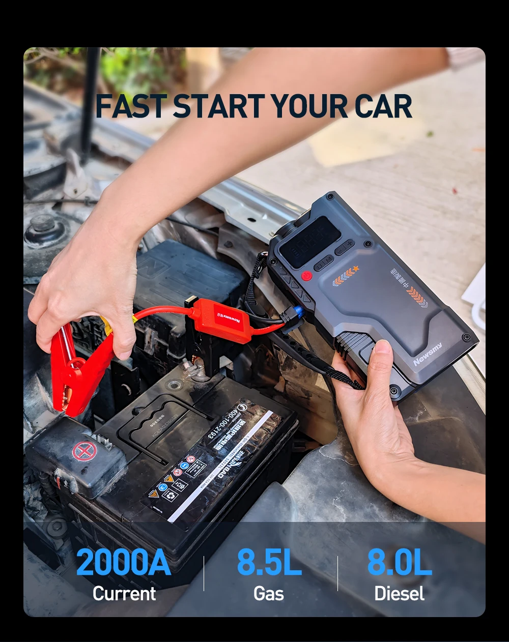 【Powerful Jump Starter】Instantly jump start a battery with 2000A PEAK CURRENT! With the V5 car battery starter, you can start all 12V vehicles (up to 8.5L gas and 8.0L diesel engines). It’s universally compatible with cars, trucks, motorcycles, lawnmowers, SUVs, snowmobiles, boats, etc.