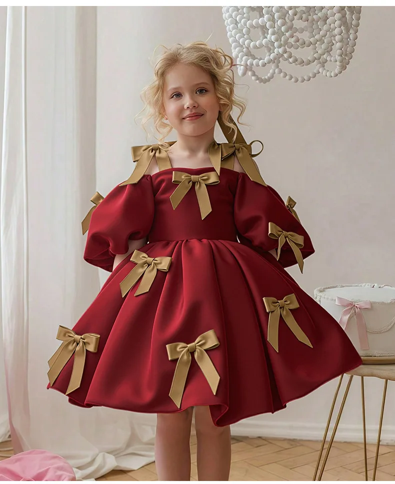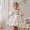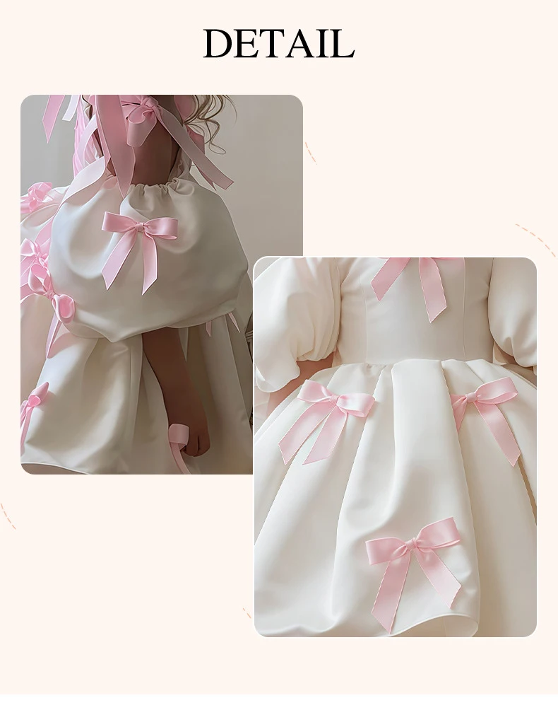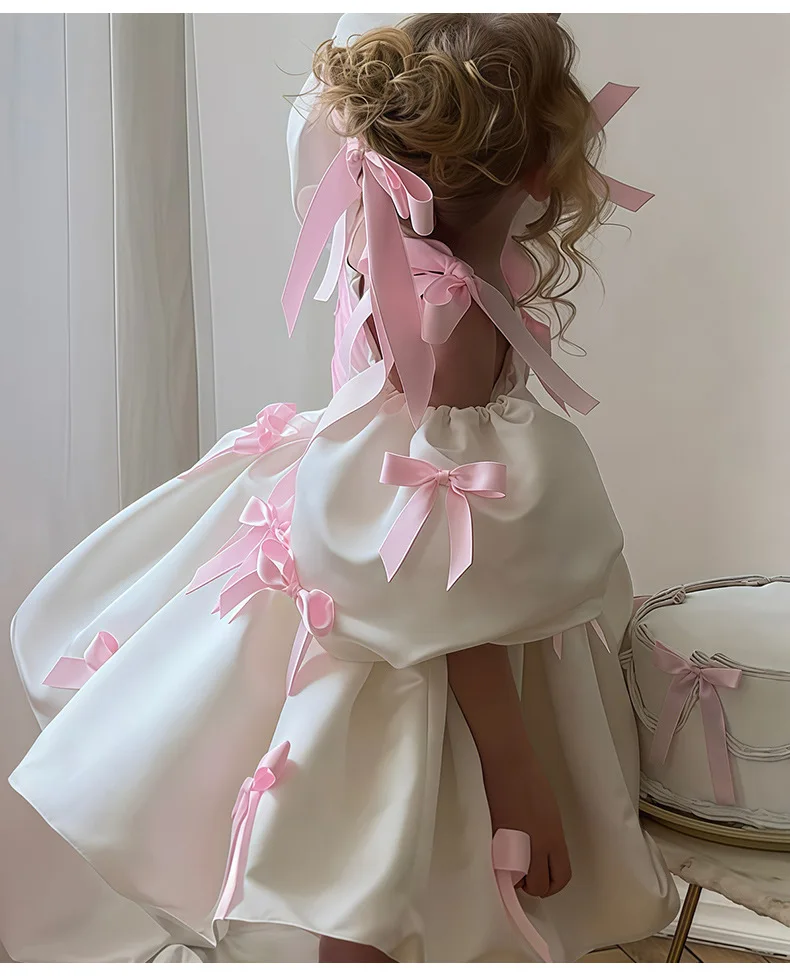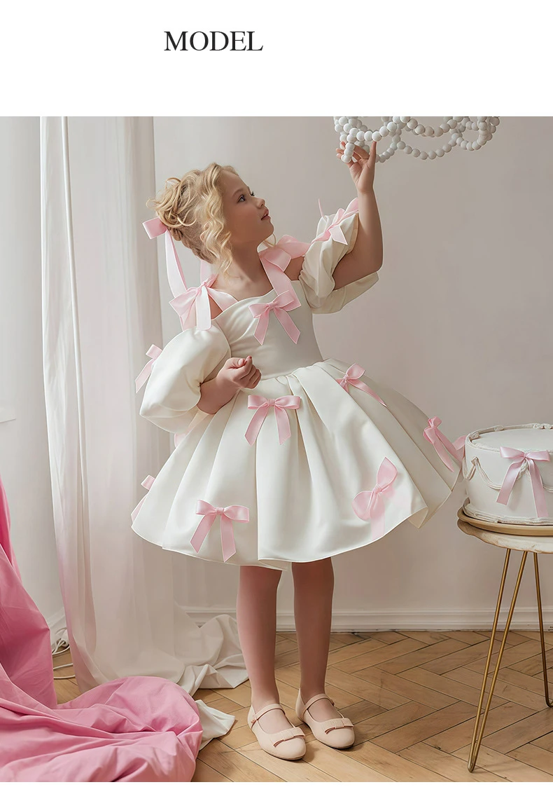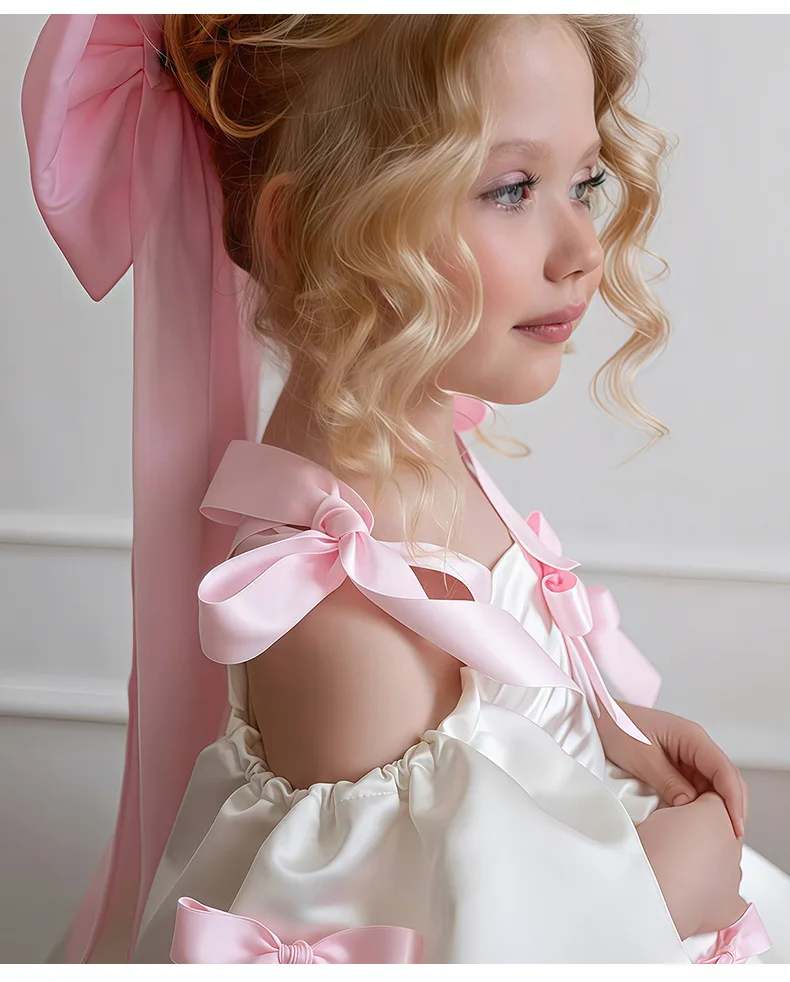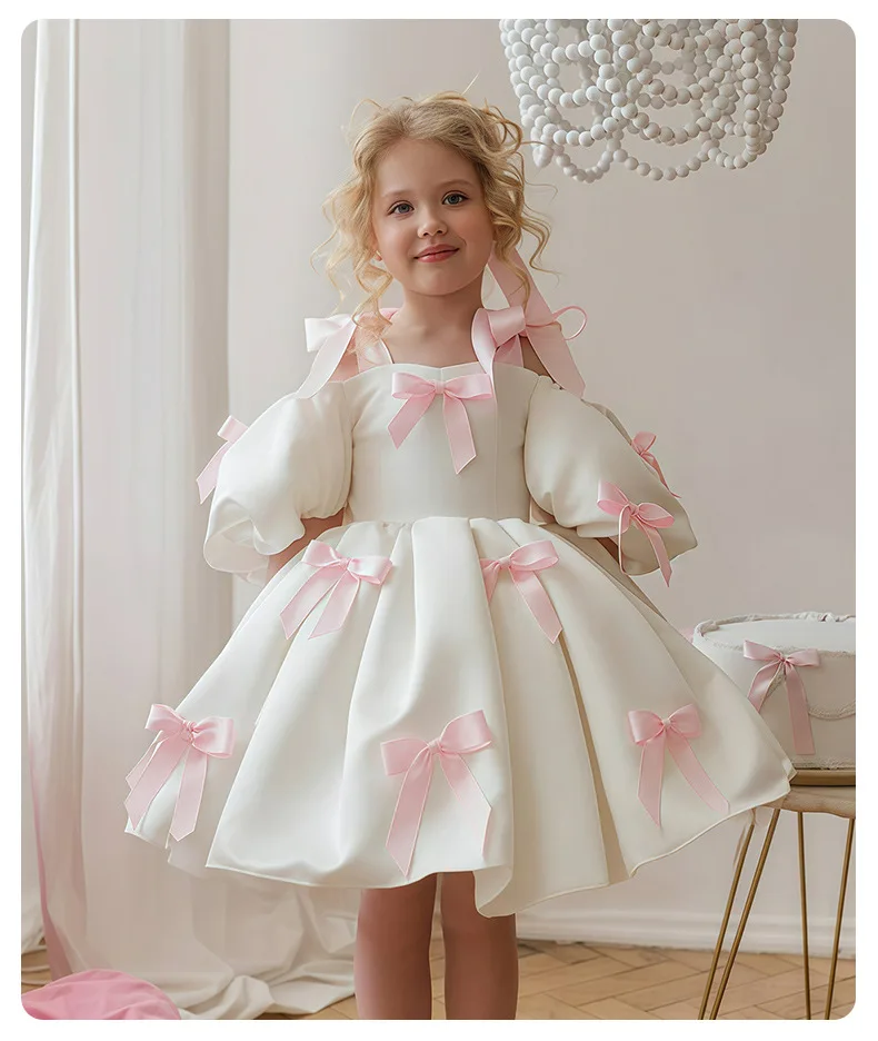 Off Shoulder White Princess Dress for Girl 2-3Y Pink Bow Fancy Birthday Party Gowns Puff Sleeve Formal Wedding Flower Girl