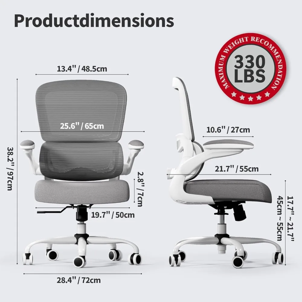 - Comfortable Breathable Mesh Seat: This office chair offers a spacious seating area, accommodating various body types. Overall dimensions (including arms): 25.7″ W x 17.3″ D x 46.9.3″-49.2″ H, Seat dimensions: 20″ W x 17.3″ D x 18.5″-3″ H. It can support up to 330 lbs. Its unique recline function allows you to tilt the backrest (90~120°) or sit upright freely, ensuring your comfort and relaxation