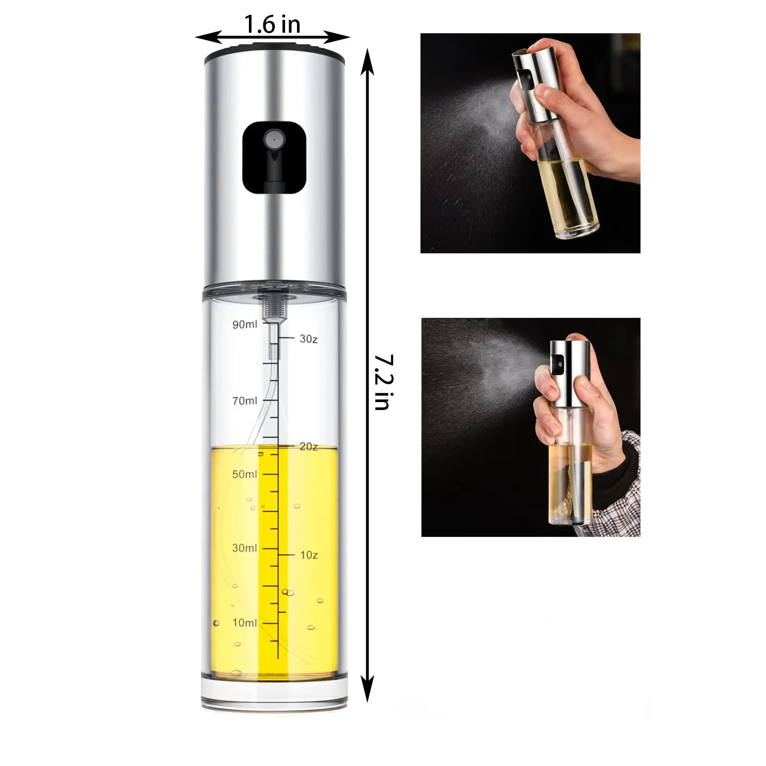 [Design]: Our oil sprayer is made of 304 stainless steel and transparent glass, with raised and extended nozzle and non-slip button, press hard several times to show the mister. You can easily use it to spray food, it is a hand gadget for the home & kitchen.