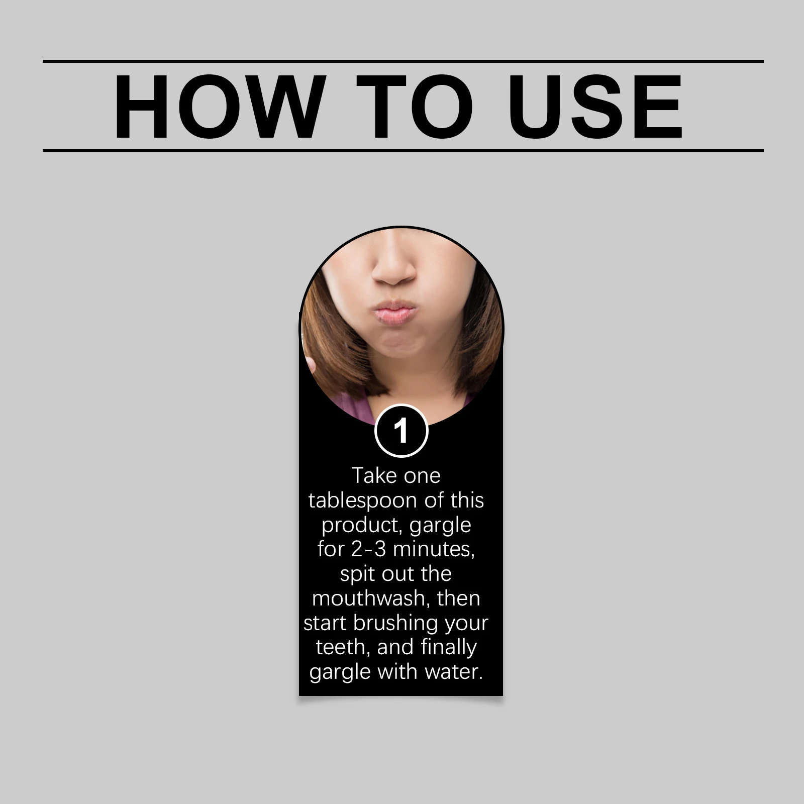 Take one tablespoon of this product, gargle for 2-3 minutes, spit out the mouthwash, then start brushing your teeth, and finally gargle with water.