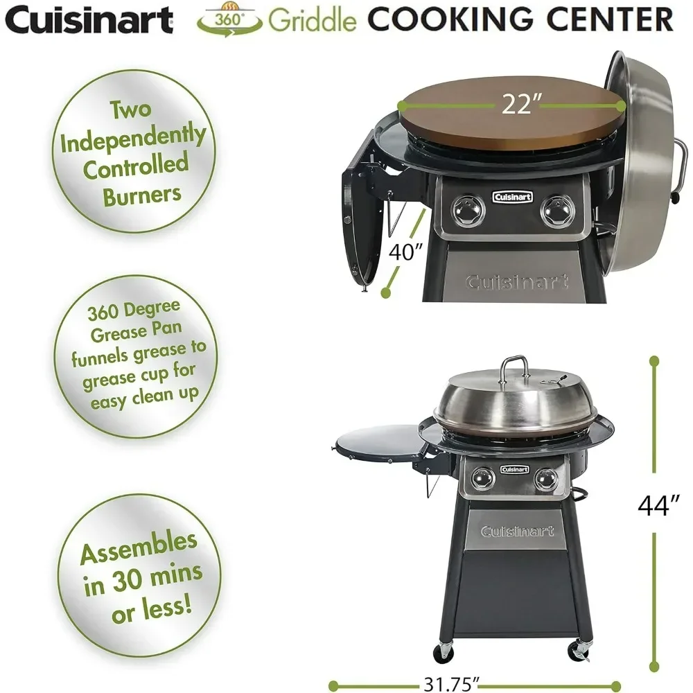 Experience 360° of griddle cooking versatility! Whether you are cooking for a small crowd or a large party, the Cuisinart 360° griddle cooking center will amaze any audience. Breakfast, lunch & dinner, the 22″ diameter cooking center can handle it all! It features a 360° grease pan & rear grease cup, making for easy access & clean-up. The cooking center comes with a quick access paper towel holder. It also includes a stainless steel lid with an integrated vent, enhancing the features of a normal griddle! This lid creates versatility to steam, roast, smoke or warm! From eggs & pancakes to burgers or stir-fry, the Cuisinart 360° griddle cooking center gives you the ability to explore your culinary creativity.