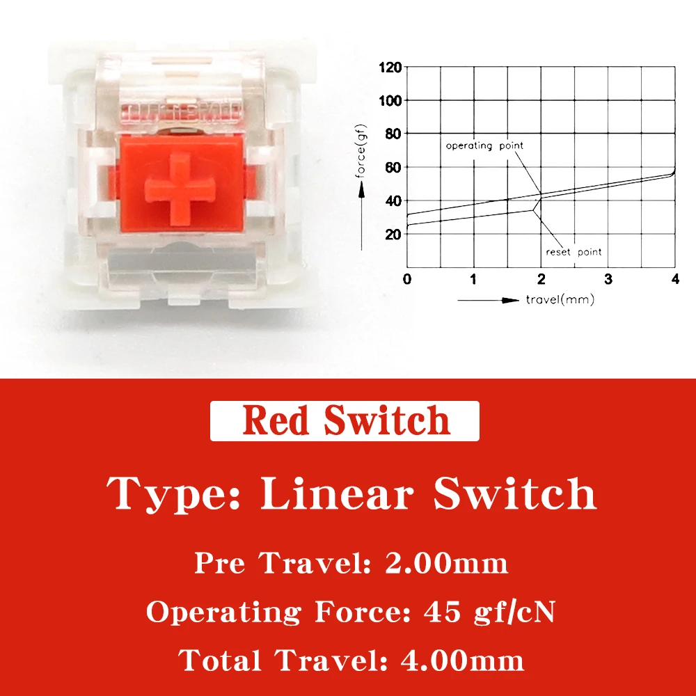 【Descriptions】 The linear switching characteristic combined with the low spring resistance triggers directly. The Outemu Red Switch is the first choice for beginners in the world of mechanical keyboards.The smooth-running enables balanced writing and gaming sessions.