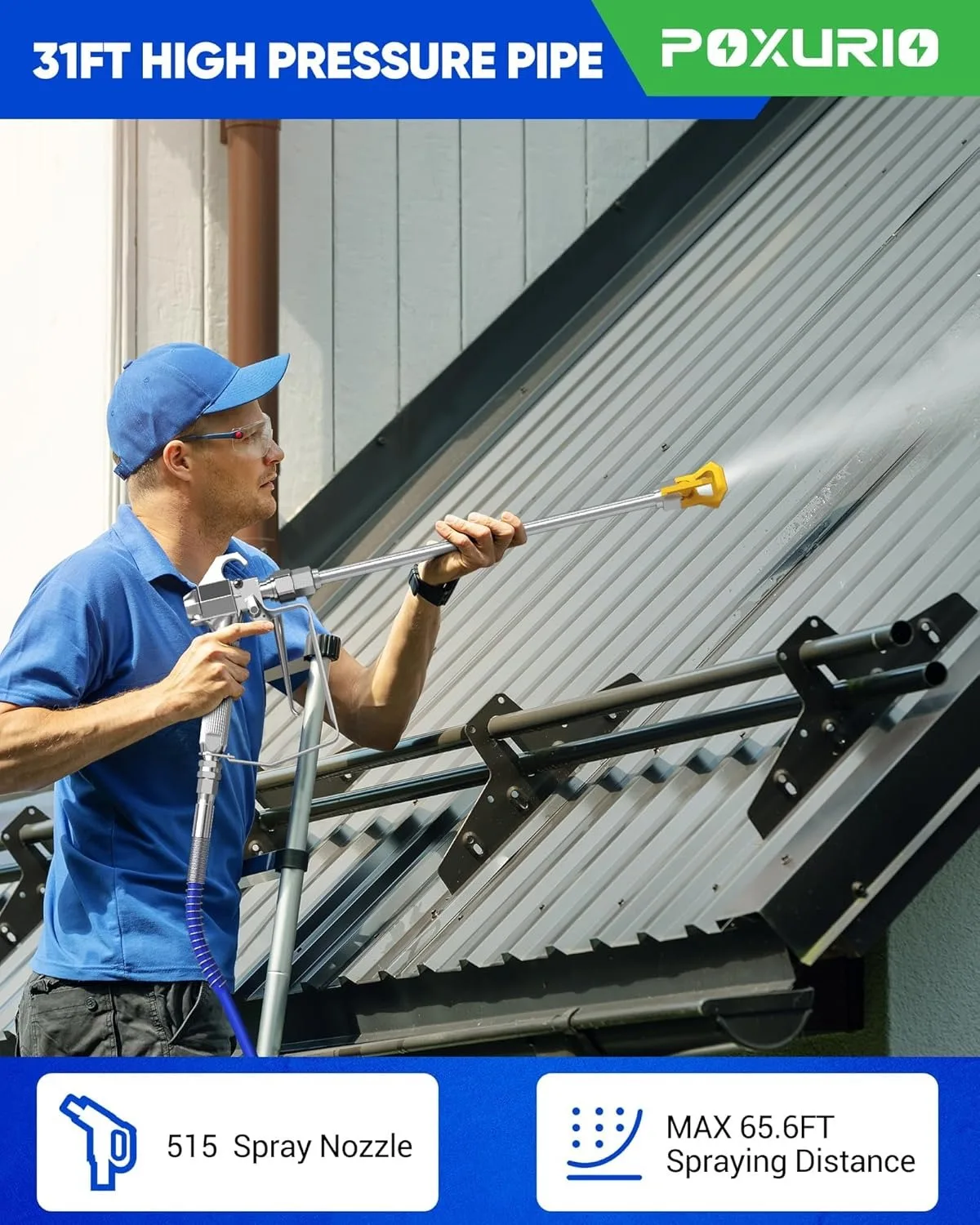 - 【COMPACT DESIGN】POXURIO stand airless sprayer weights only 16.5 lbs, and is also designed with a multi-purpose portable handle and a 29.5 ft. long hose storage rack, making it not only convenient to store, but also easy to move and carry.