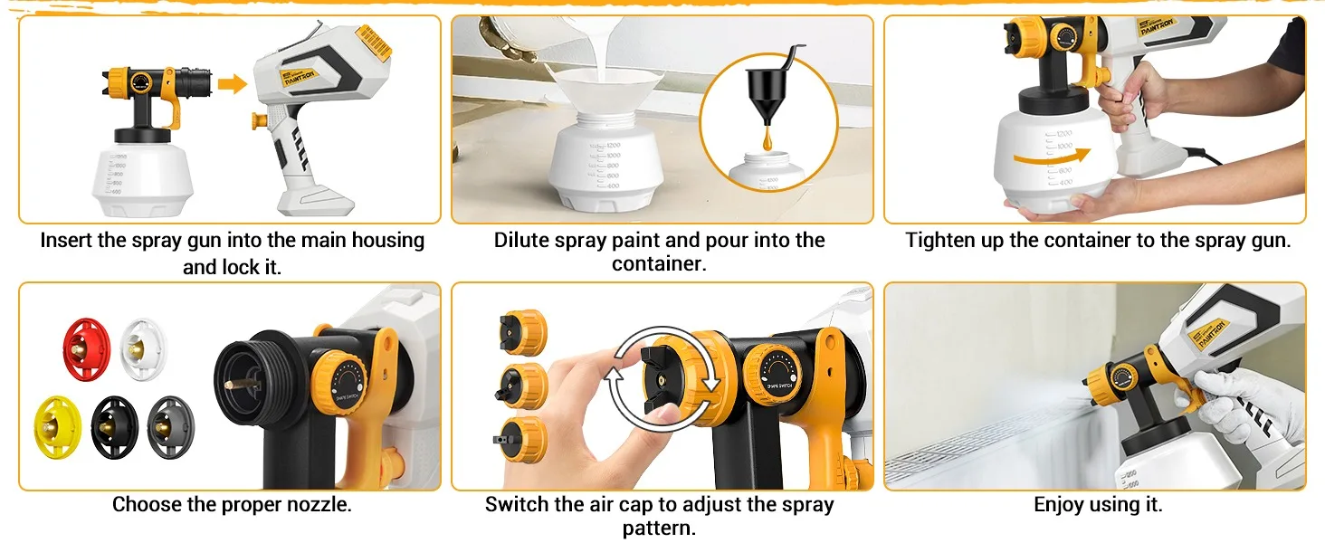 - đ ăEasy to Use & CleanăThe paint sprayer is designed for effortless assembly without the need for tools, making it accessible even for beginners. Simply follow the manual to get started quickly. Proper cleaning is essential after each use, and the sprayer includes a cleaning brush and needle to ensure any residual paint in the nozzle is thoroughly removed.