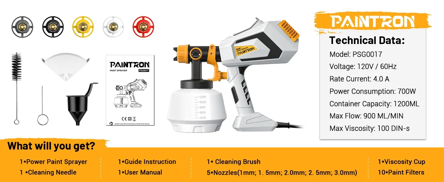 - đ ă5 Brass Nozzles & 3 Spray PatternsăThe PAINTRON 700W paint sprayer comes with 5 brass nozzle sizes (1mm, 1.5mm, 2mm, 2.5mm, 3mm) suitable for various painting projects such as furniture, pickup trucks, walls, doors, garden tables, and chairs. It offers three adjustable spray patterns: horizontal, vertical, and circular, making it versatile for a wide range of applications.