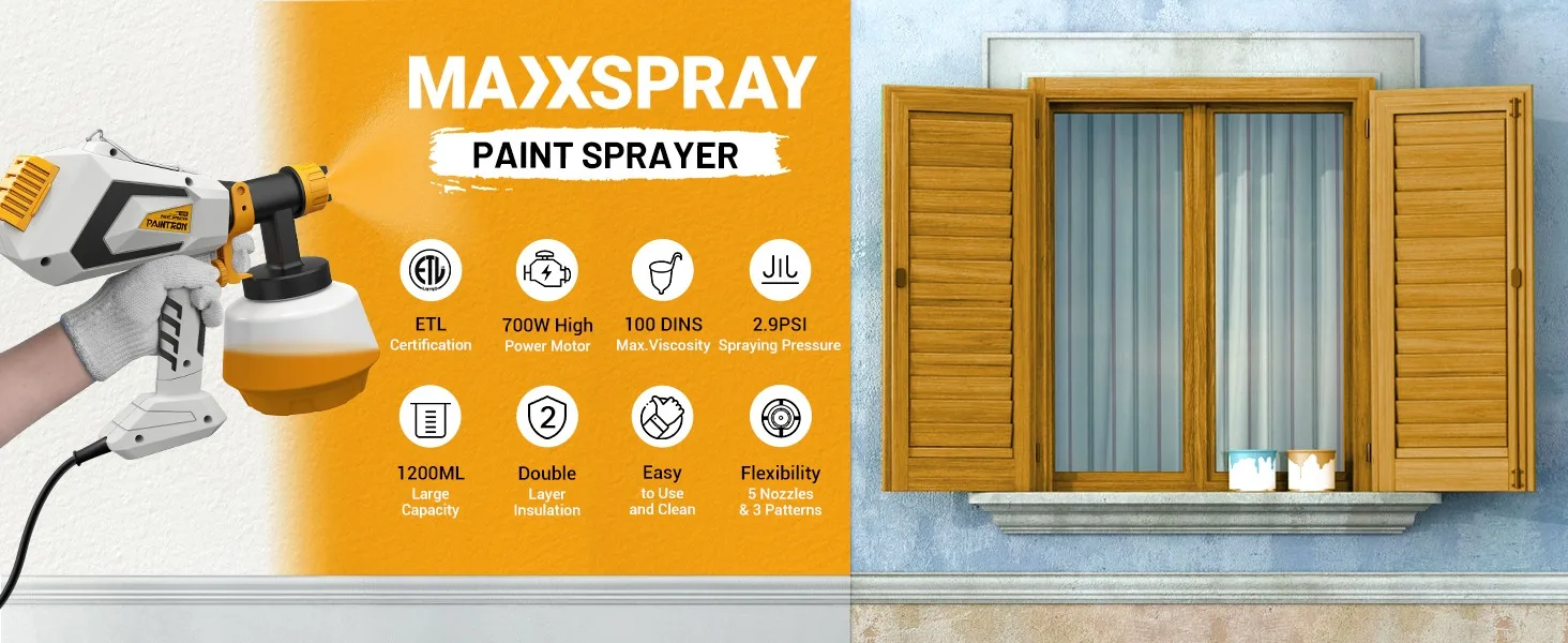 - đ ăUse with a Variety of MaterialsăThis Paint Sprayer, featuring a powerful motor and turbo fan, supports a maximum viscosity of up to 100-DINs. It handles most paint types, including latex, stains, sealers, urethanes, varnishes, lacquers, and chalk paint. Ideal for home improvement and DIY enthusiasts, this Spray Paint Gun is perfect for various tasks.