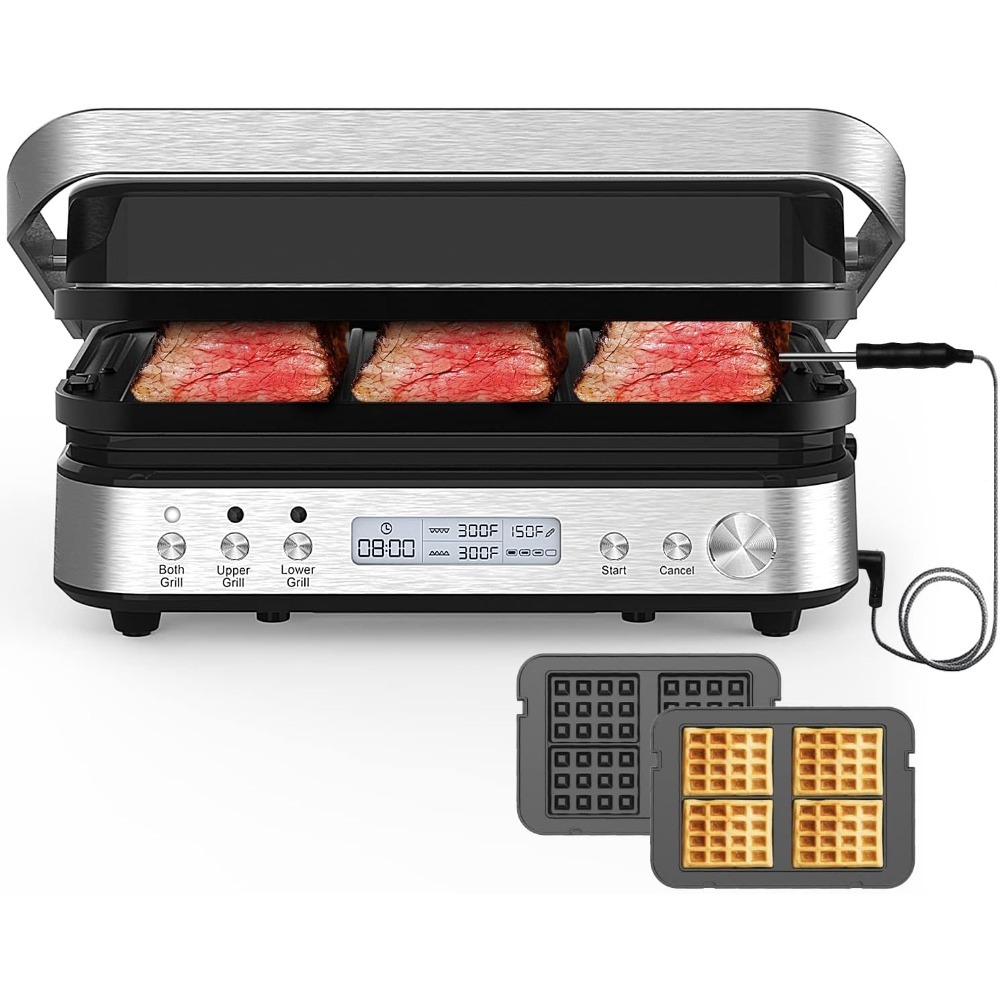 - 🍠【Meat Thermometer】No need to cut the food check inside, or constantly probe them by using an instant-read thermometer. Our panini grill comes with a smart meat thermometer and can set the probe function independently, there are 5 setting modes. When the food reaches the set temperature, it will beep to remind you. Enable intelligent temperature control and cooking. It is the best party supplies for family gatherings and new year celebration.