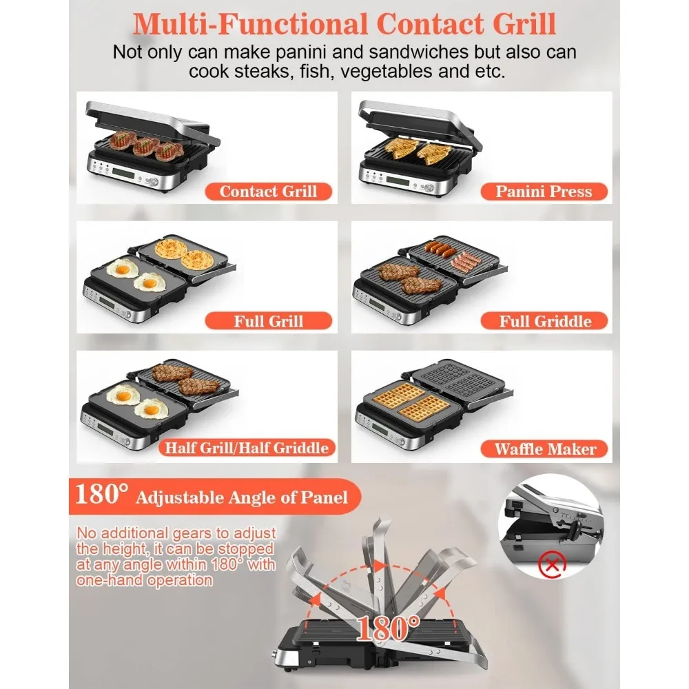 - 🌮【6 in 1 Panini Press】CATTLEMAN CUISINE indoor grill can be used as contact grill, panini press/sandwich maker, full grill, full griddle, half grill/half griddle, or waffle maker for different cooking needs in one machine. The double damping hinge structure allows 180° rotation of the lid, better for different thicknesses of food. No additional gears to adjust the height, it can be stopped at any angle within 180° with one-hand operation.