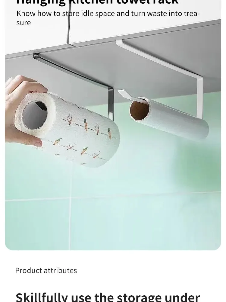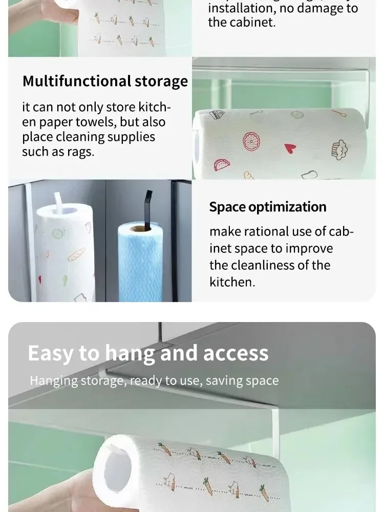 3、Damage Free: Quick installation without drilling. Fits perfectly on your cabinets without drilling any holes in the cabinet door.This paper towel holder can go under the cabinet and the shelf or hang on the cabinet door.
