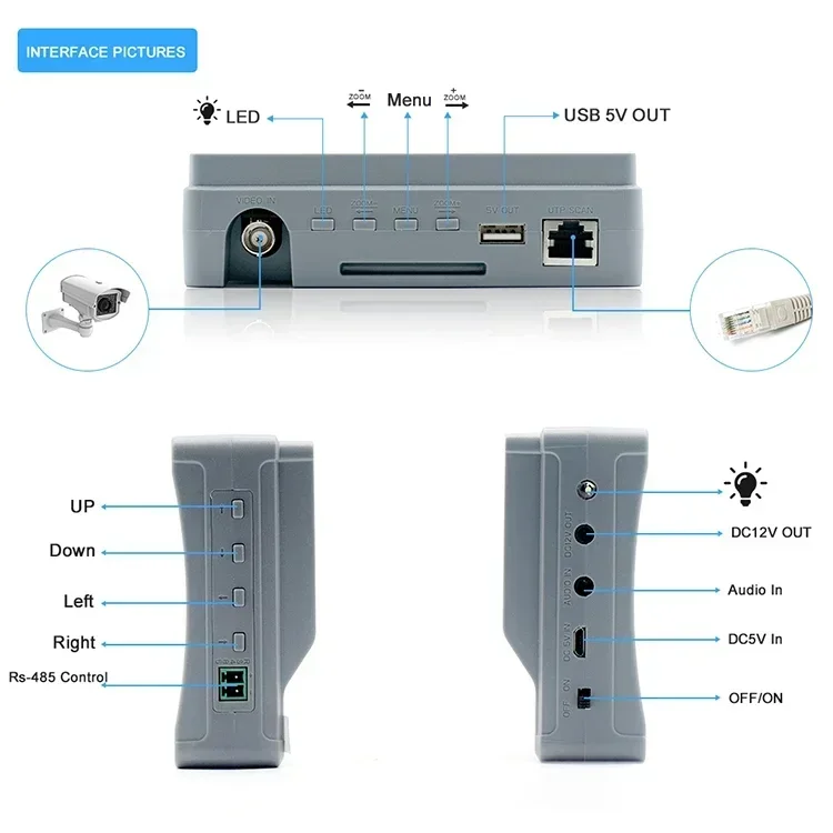 Video monitor tester built-in Pelco-D / P PTZ control protocol,etc. , through its own RS485 interface, the user can control the PTZ up, down, left, right rotation, and adjust one machine zoom, focus,aperture size.