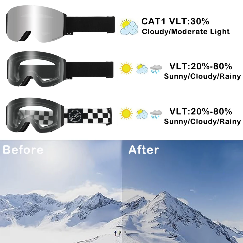 Experience optimal vision on the slopes with photochromic lenses that adjust to changing light conditions, ensuring clear sight at all times.
