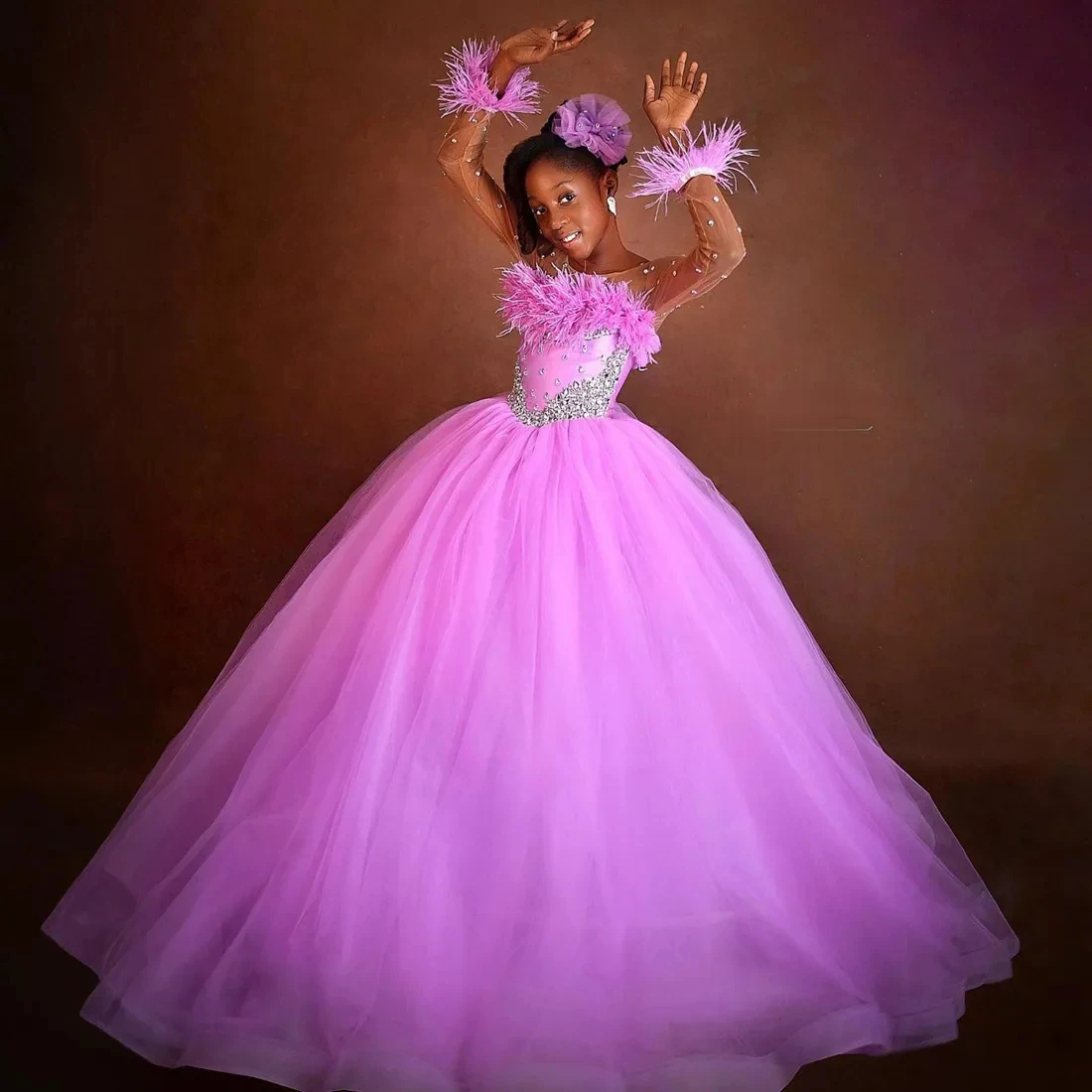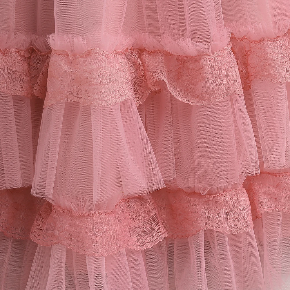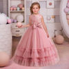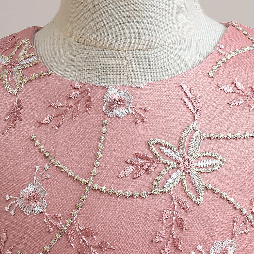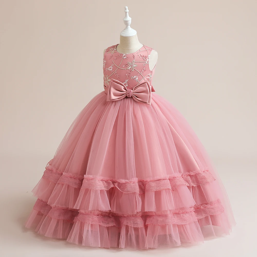 Pink Embroidery Flower Girls Dress Bow Children Costume Tulle Long Bridesmaid Party Dresses For Girl Birthday Wedding Prom Gown