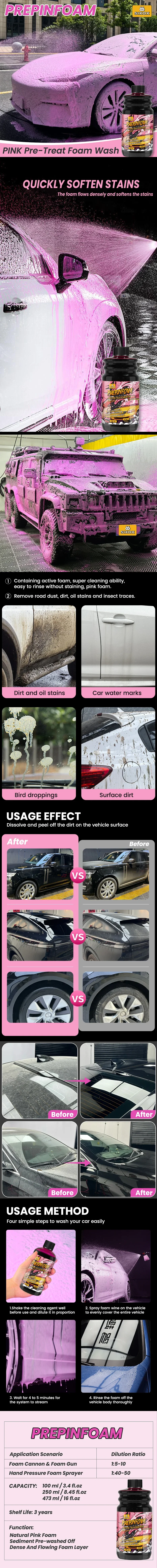 As a pre-treatment foam for car washing, this product is capable of dissolving and stripping dirt and debris from the surface of the vehicle, thereby reducing the risk of scratches to the car paint during the washing process.