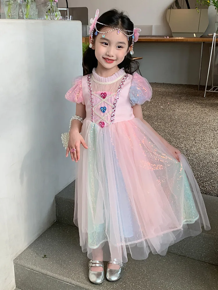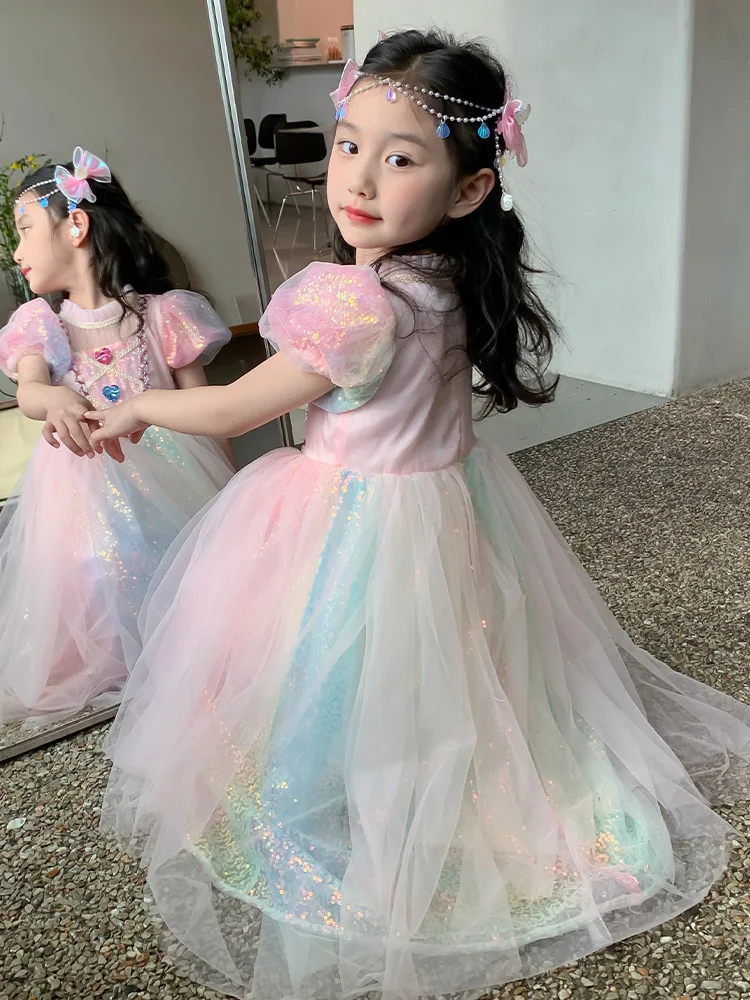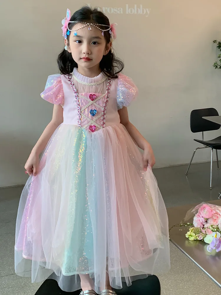 Pink Ombre Rainbow Princess Dress for Girls Summer New Fashion Baby Toddler Birthday Party Gown