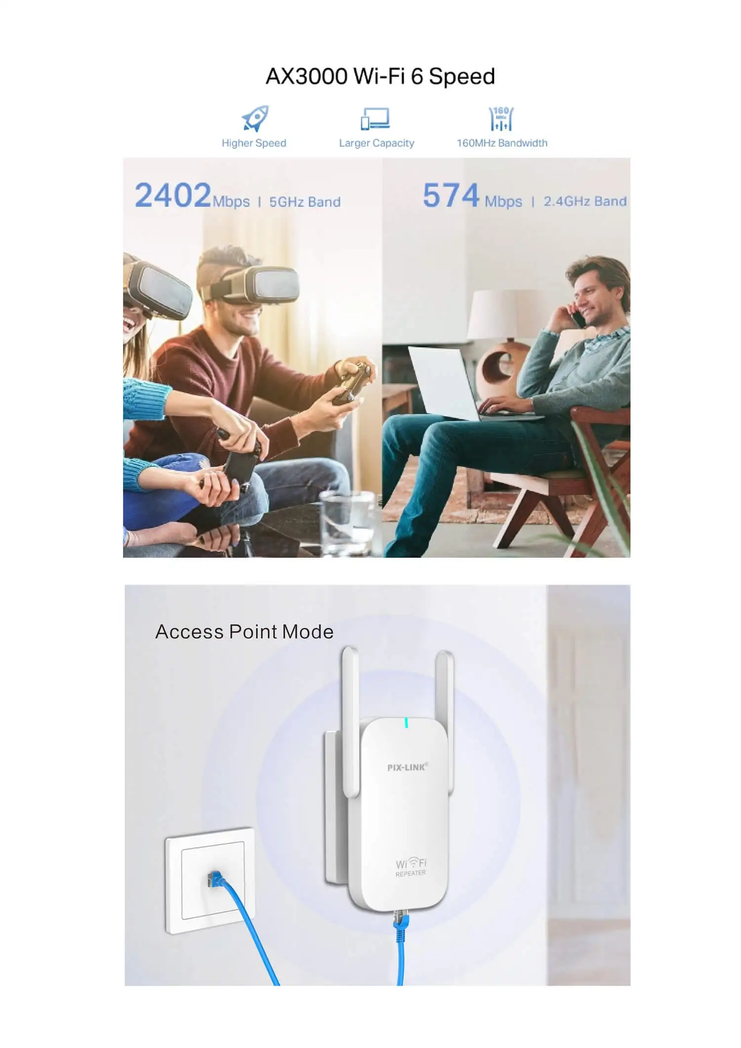 Dual-band WiFi6- Separate 5GHz(2402Mbps) and 2.4GHz(574Mbps)WiFi bands, using the latest technology to achieve moreFaster speed and more