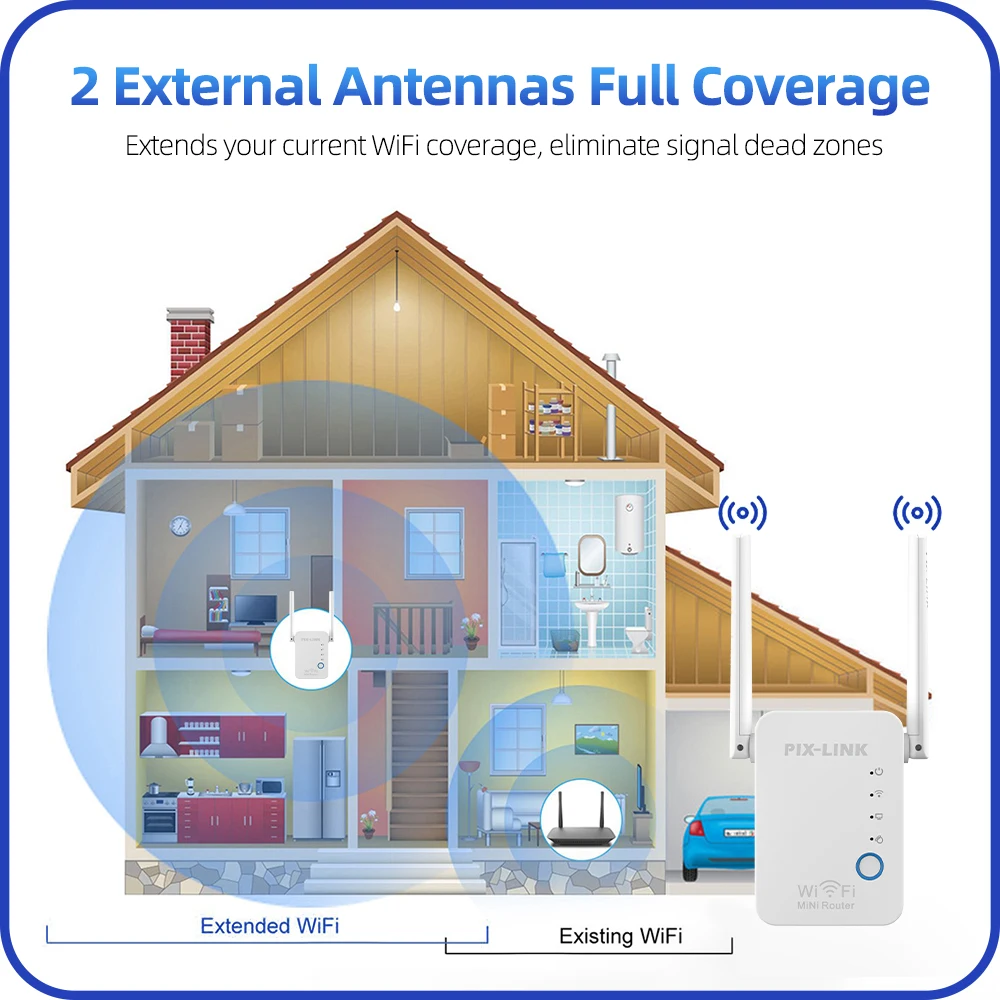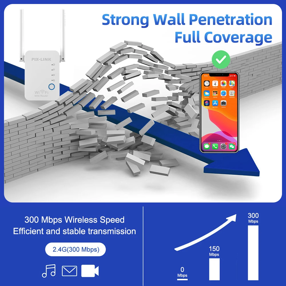 Long Range Signal Wi-Fi :Enjoy high-speed internet connectivity from a distance with the PIX-LINK WR17 Wireless Mini Router WiFi Repeater Access Point Mode Antennas Booster 2.4G Amplifier Long Range Signal Wi-Fi.