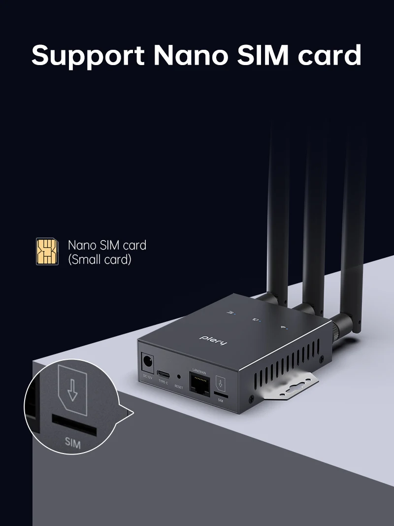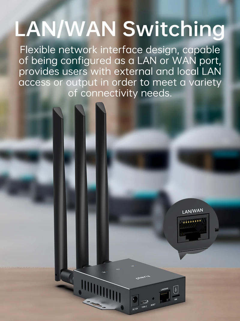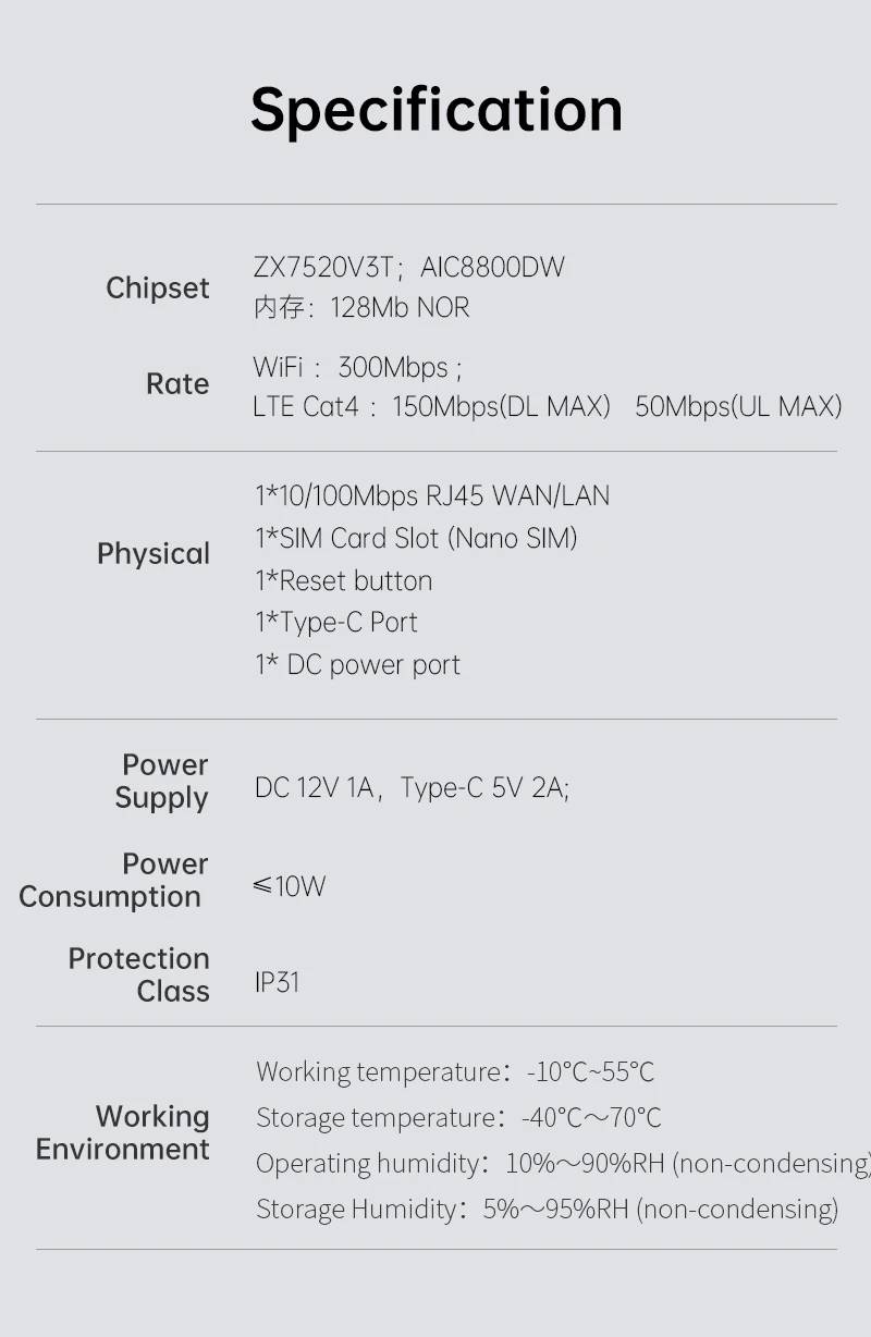 Device Interfaces:1 x SIM Card Slot,1 x RJ45 10M/100M LAN/WAN Ethernet Interfaces,1 x Reset Button,1 x DC Port(for charging),1 x Type-C Port(for data transfer)