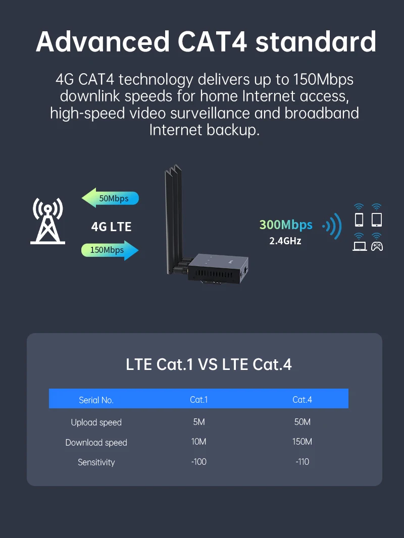 With LTE advanced signal coverage for best performance and allows you to receive Internet access without cable and fiber,it is the ideal choice for remote areas such as rural and suburban, temporary store, holiday home, giving devices ability to access to the Internet wherever and whenever the user is located.