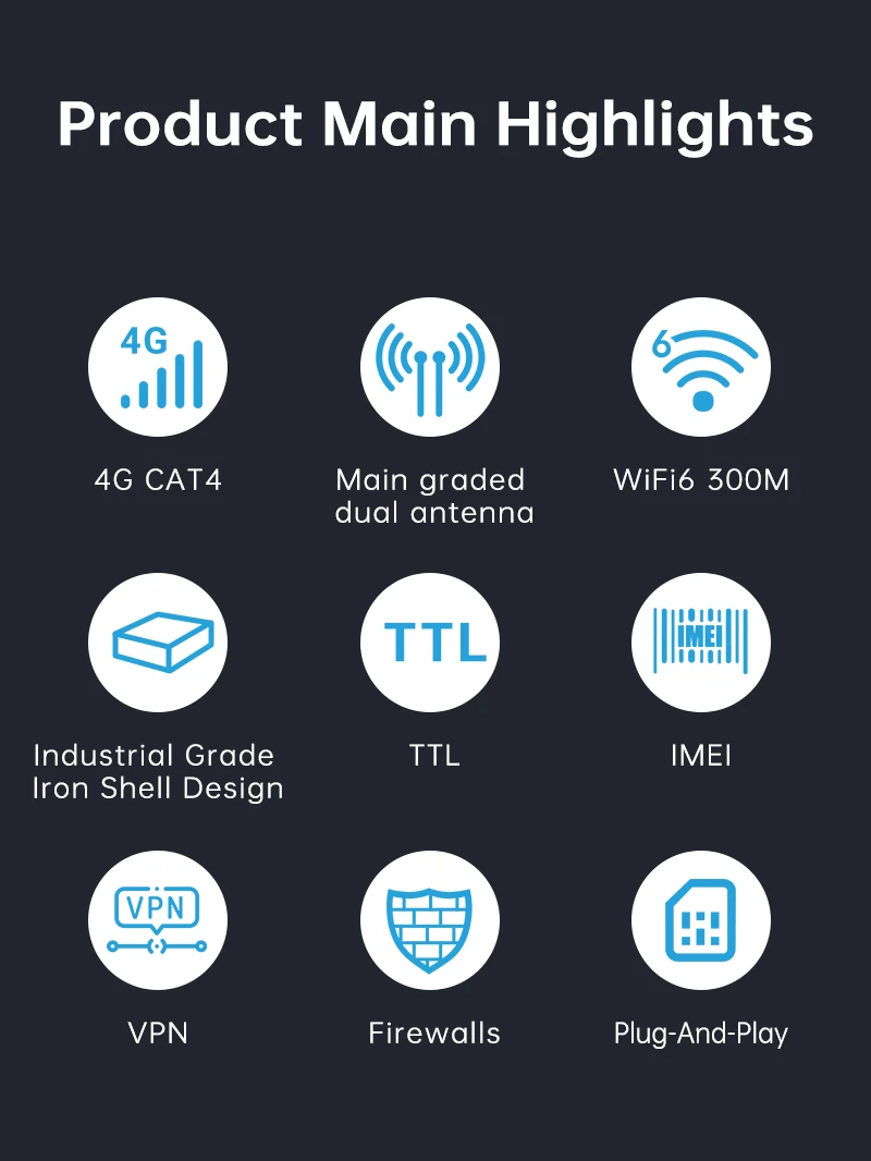 Management :User Access Restrictions,URL Filter,QOS speed limit,System Log,System Settings,Traffic Statistics of Wireless and Ethernet Networks,Ping or Traceroute to Check the Network Working Status,Iperf Speed Test,IPV4/IPV6,Upgrade Firmware from Local,Support TTL , Modify IMEI , Lock Bands, User Firewall Rules, Port Mapping,