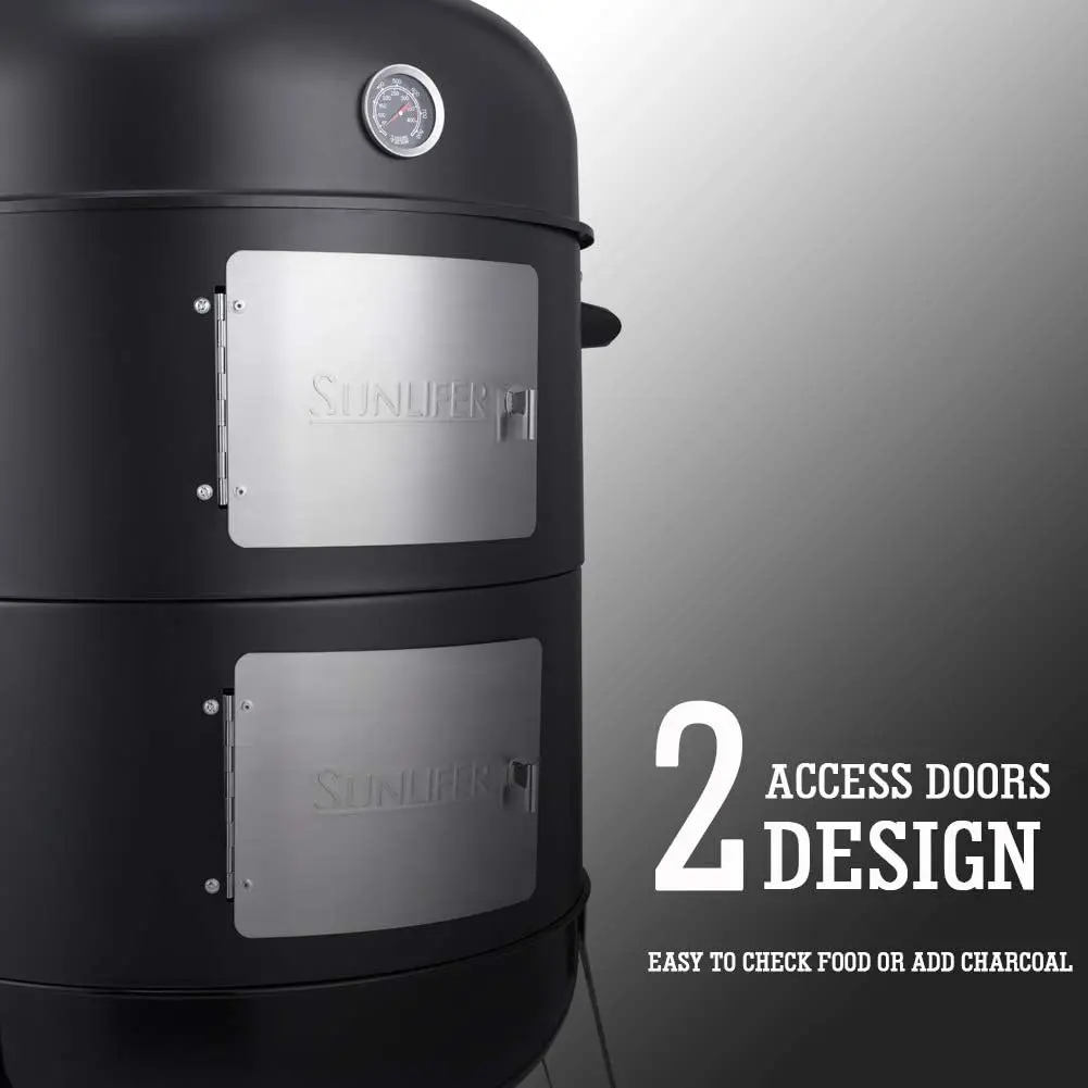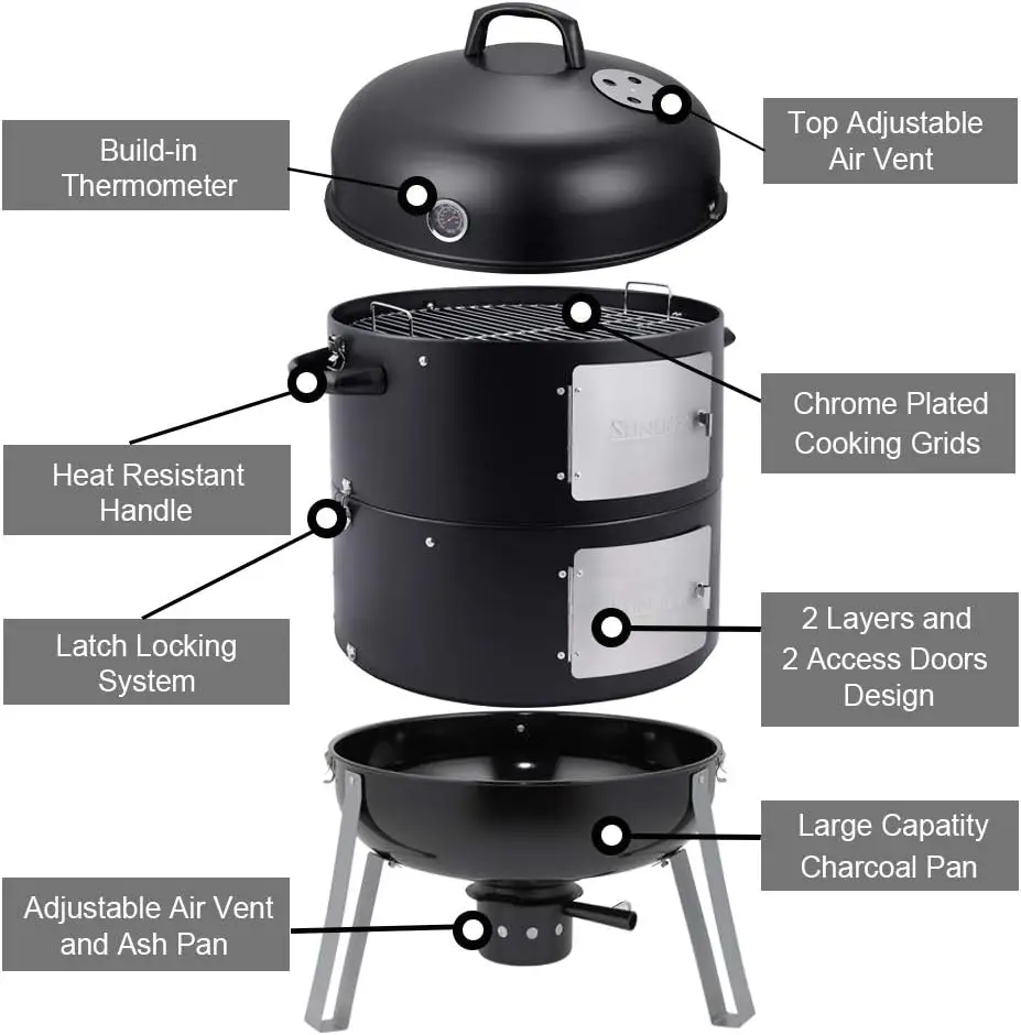 - 2 ACCESS PANELS BBQ SMOKER GRILL: The bottom door of bbq smoker pit is easy to look-over and add charcoal or coal.If you use it as a wood smoker, you also can add flavor pellets or wood chips through the bottom door. The upper door can be used to quickly food checking without losing extra heat