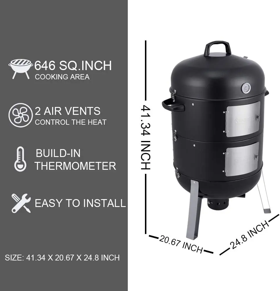 - MEET YOUR NEED CHARCOAL GRILLS: The 3-in-1 multi-purpose bbq barrel smoker grill is flexible to match your needs at your backyard, balcony, garden, patio, camp, picnic or travel barbecue | ideals for outdoor cooking, smoking, steaming, baking, braising, roasting, searing