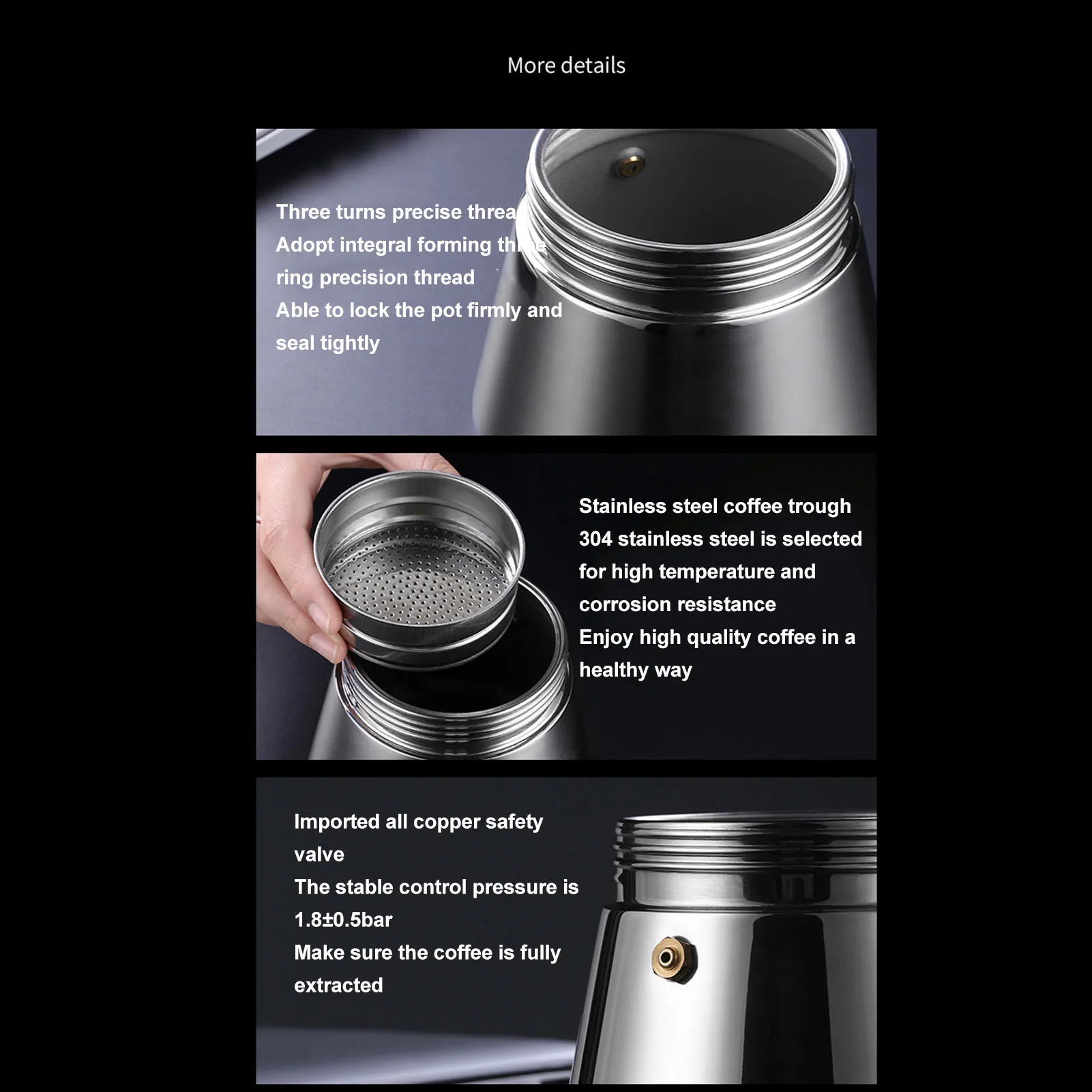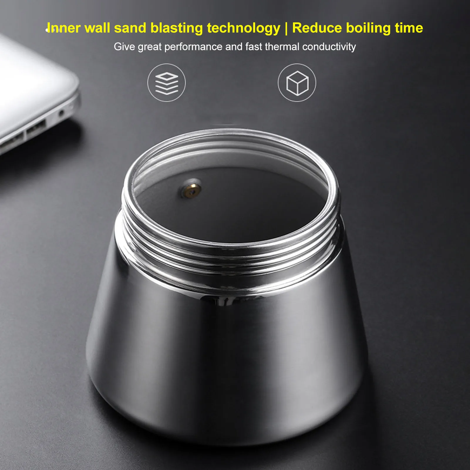 3. Easy to Use: This stovetop mocha pot can be heated on different devices, including induction, ceramic, gas and electric stove, will be with you for a long time.