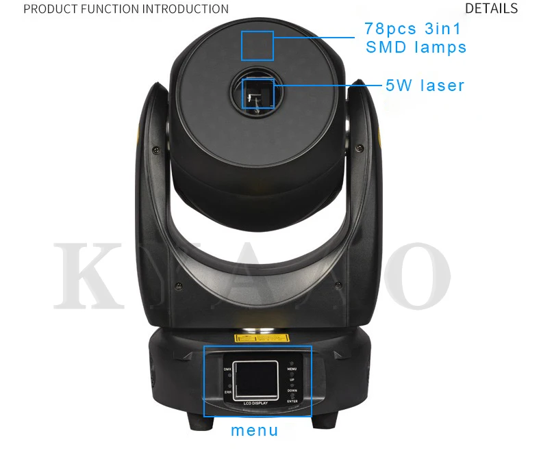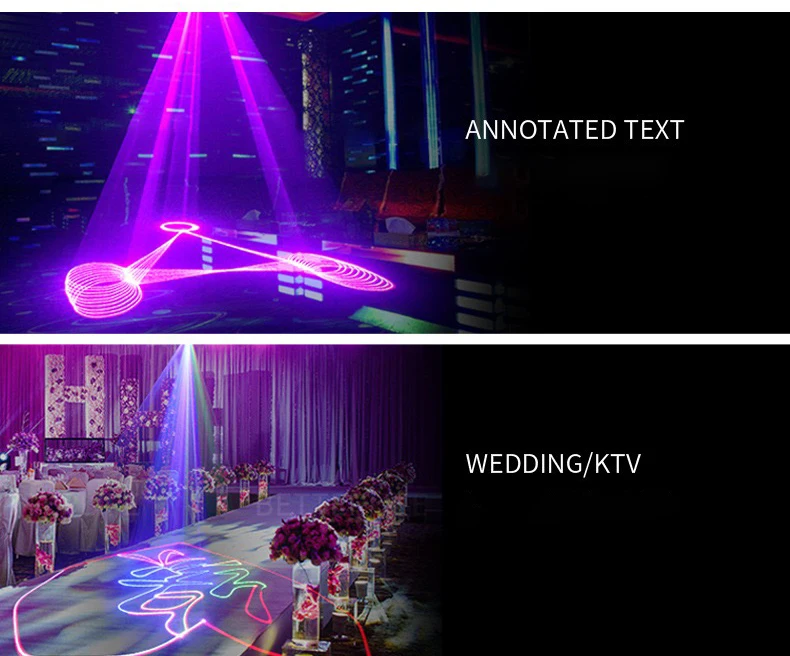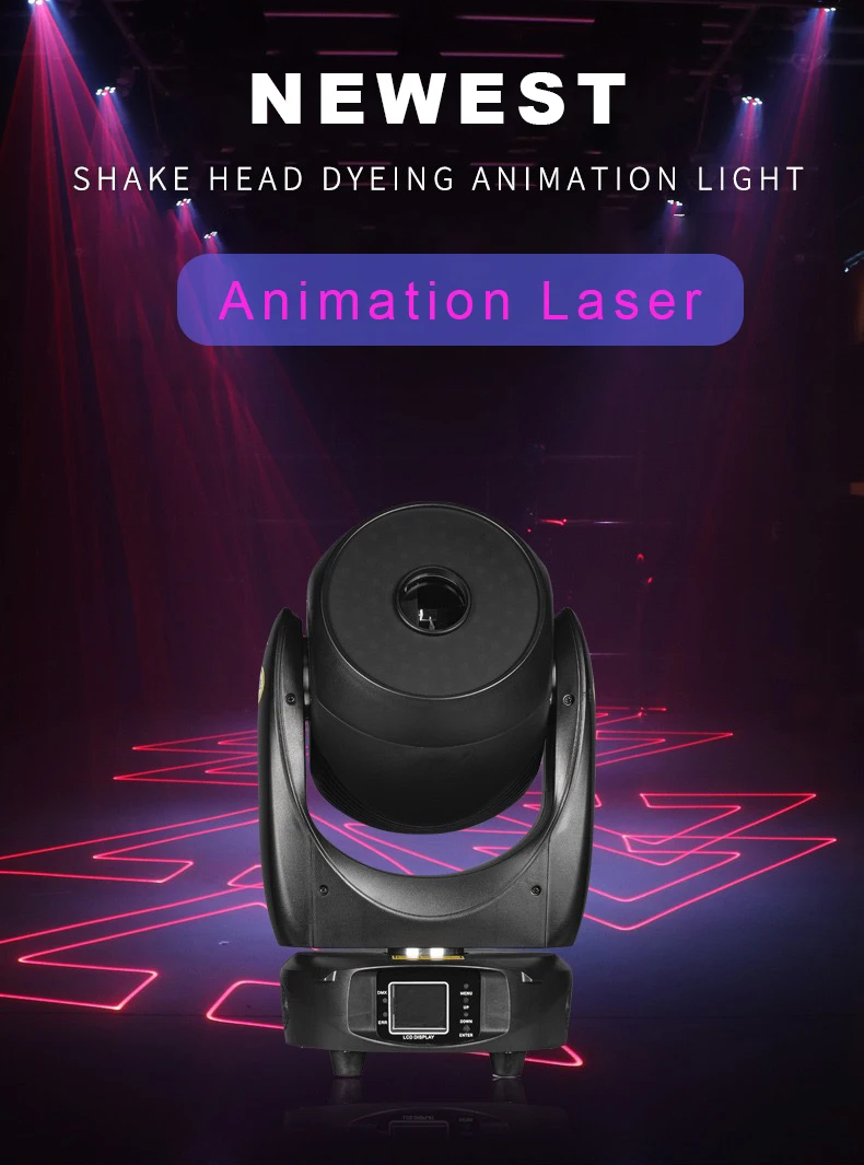The full-color moving head laser lamp is a kind of animated laser moving head lamp with small size and excellent performance. It has the following features: RDM function, controllable platform adjusting address code, small size, convenient transportation, RGB laser, low power, high light efficiency, long life, and environmental protection; Faster speed, hundreds of animation programs, strong and sharp beam in smoke state, auxiliary aperture, intelligent temperature controlled fan, more silent; It is very suitable for: bars, nightclubs, music restaurants, KTV halls, indoor multi-function halls and other places.