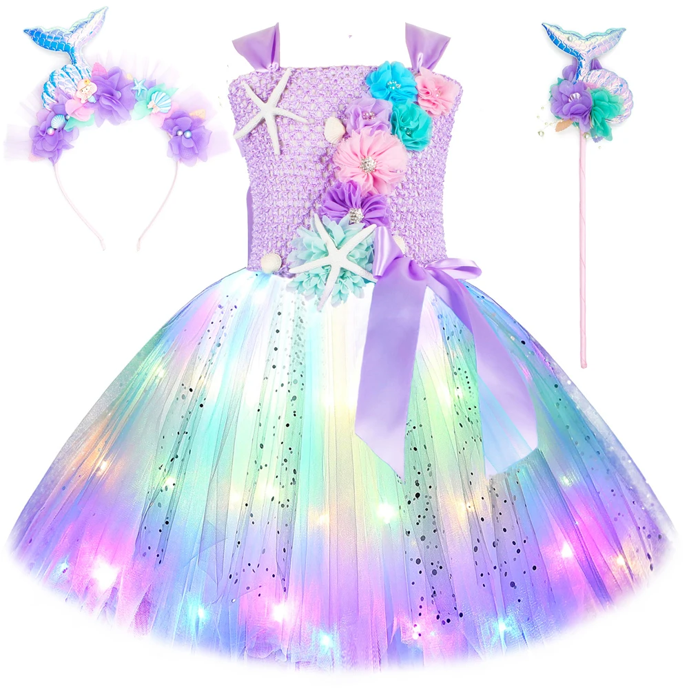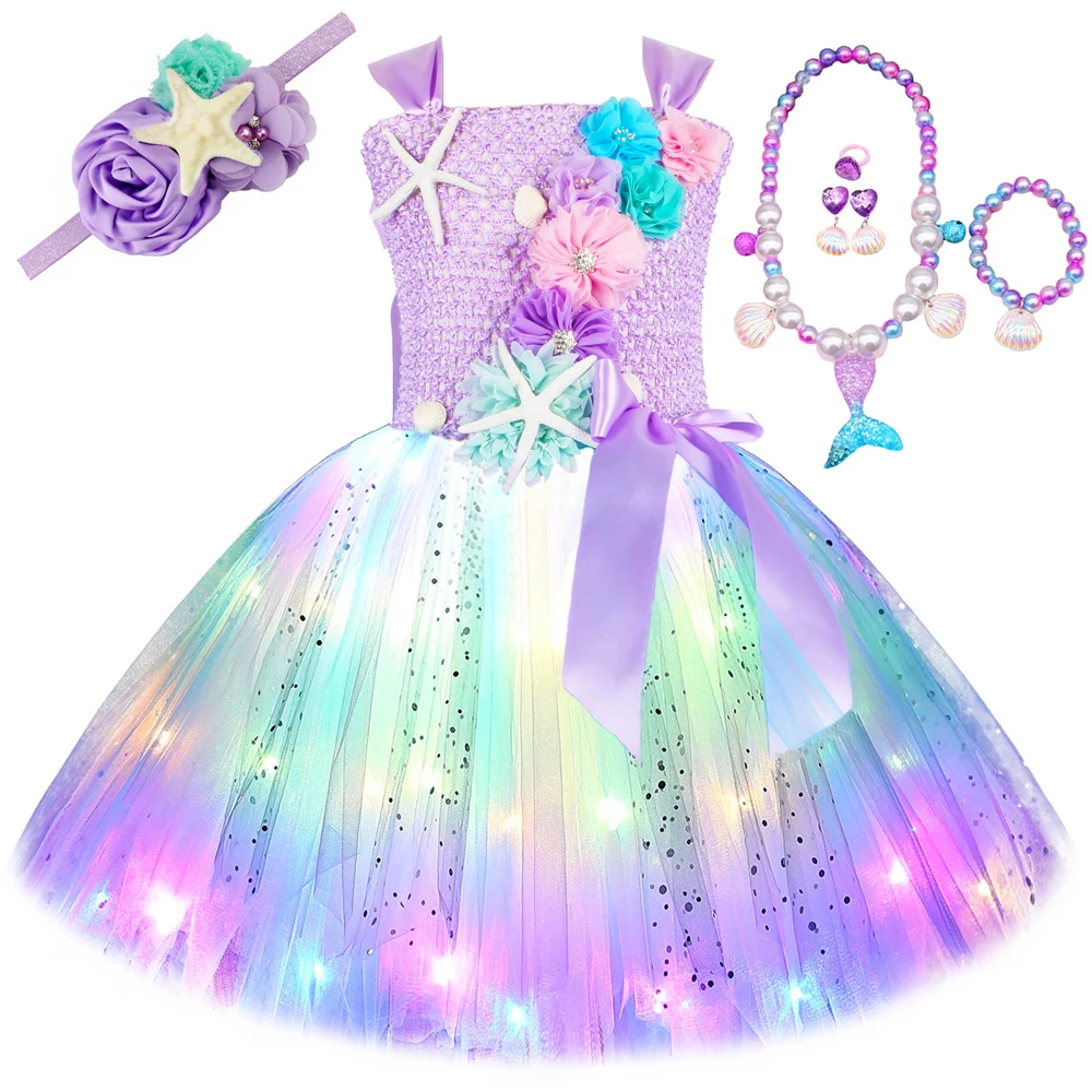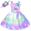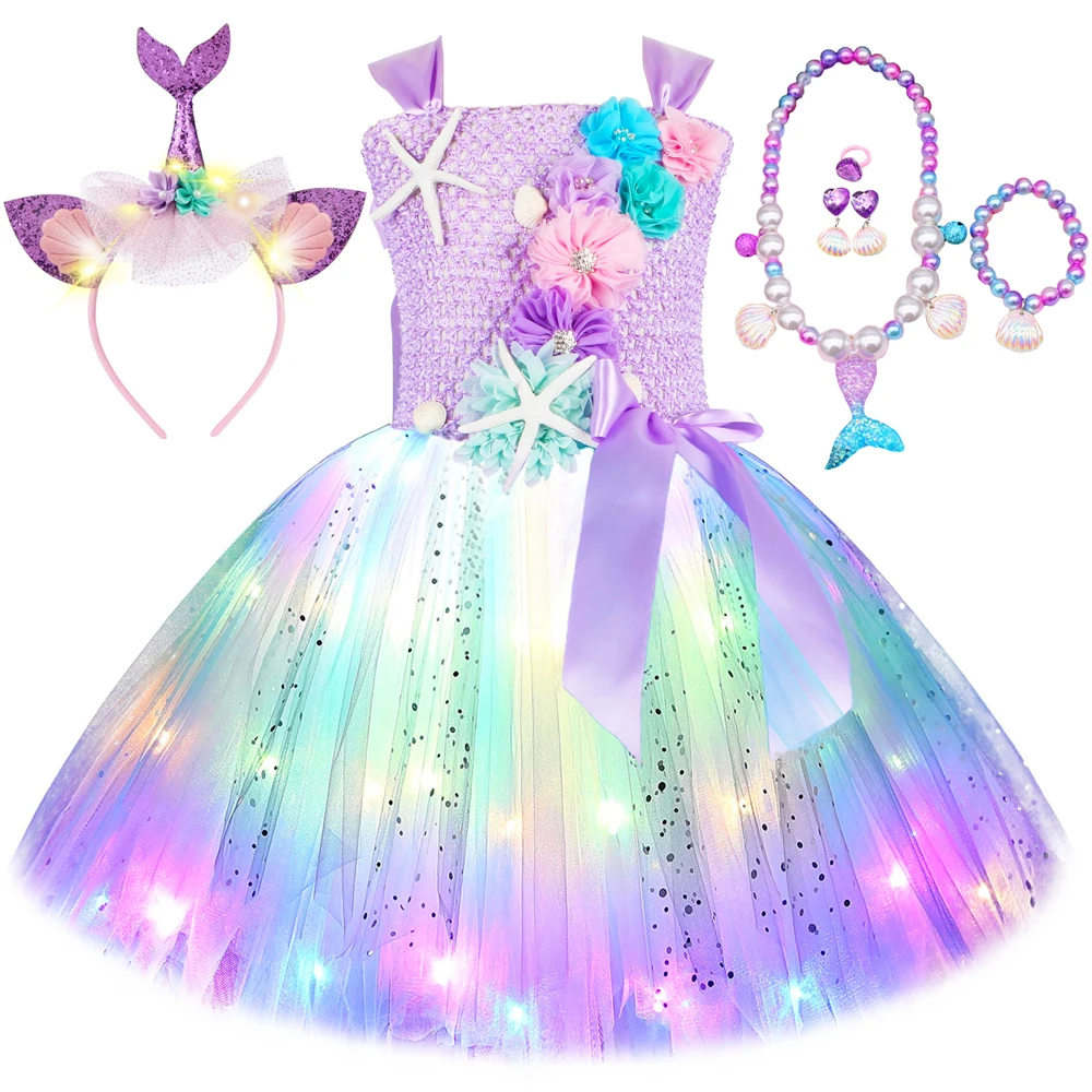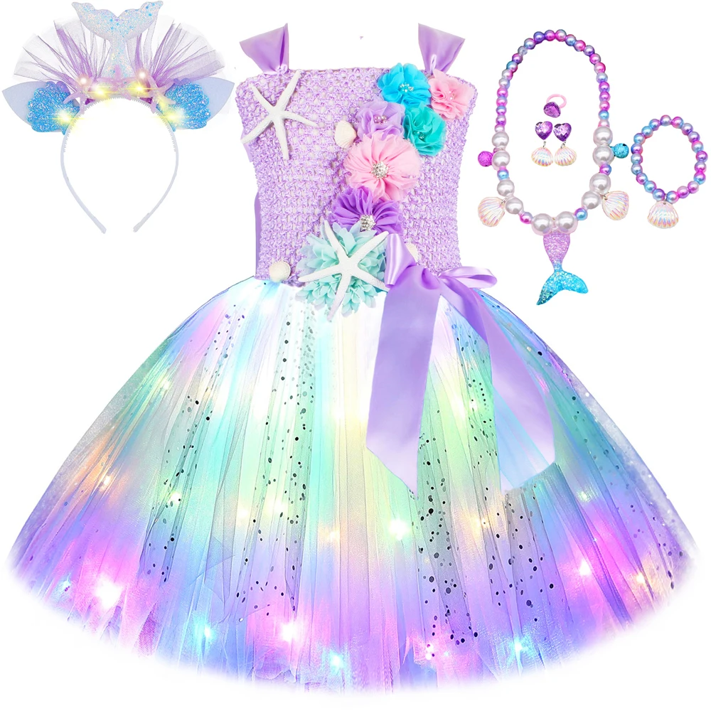 Princess Mermaid Dress For Girls Led Light Up Ocean Themed Birthday Party Tutu Dress Clothes Halloween Costume For Kids Vestidos