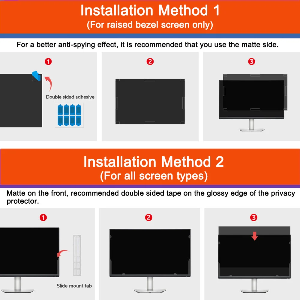 2. Install these plastic slide mount tabs on the outer rim of the screen to hold the privacy screen in place (for computer screens with a raised bezel only), allowing you to slide the filter on and off the screen as needed. All accessories and installation instructions are included in the packaging.