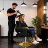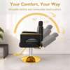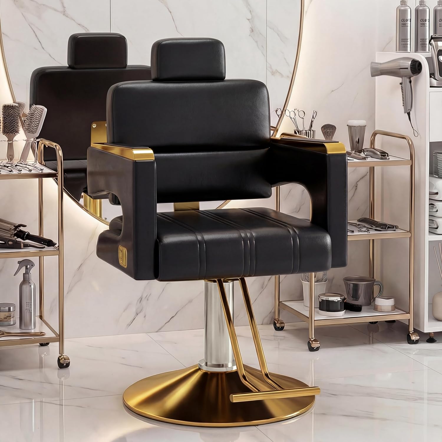 Timeless Golden Base Frame: Featuring a classic circular golden metal base, this chair combines vintage barbershop charm with modern stability. The heavy-duty frame offers 360° smooth rotation while anchoring securely to any salon floor.